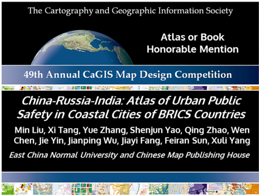 完美(中国)官方地理科学学院、地理信息科学教育部重点实验室主编的《中俄印金砖国家典型沿海城市公共安全图集》,荣获地图与地理信息学会 (Cartography and Geographic Information Society,CaGIS) 2021年度地图竞赛 Atlas/Book 分项 Honoralble Mention 奖二等奖。
