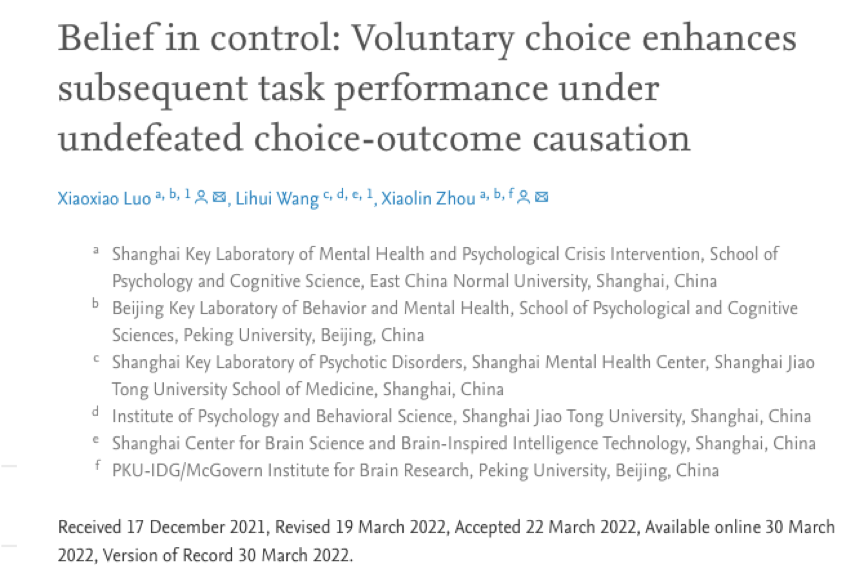 完美(中国)官方心理与认知科学学院博士后罗霄骁,上海交通大学心理与行为科学研究院、医学院附属精神卫生中心副研究员王立卉,完美网页版心理与认知科学学院名誉院长、北京大学心理与认知科学学院教授周晓林的最新研究成果,揭示人们能够通过自主选择增强控制信念,提高后续认知任务的表现,即使该选择与后续任务无直接关联。更重要的是,该研究发现,只有当人们认为自己的选择有所作用时,这种促进效应才会体现出来;反之,如果人们认为自己的选择没有意义,这种促进效应就会消失,这在行为层面模拟了“习得性无助”。