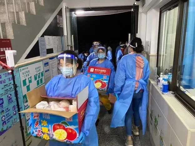 封控管理期间一日三餐和各类物资的搬运发放,最开始一直由几位楼层长和固定的志愿者承担,每天身穿防护服搬运六七十人的餐食跑上跑下,做好防护的前提下再为每个寝室进行无接触配发。