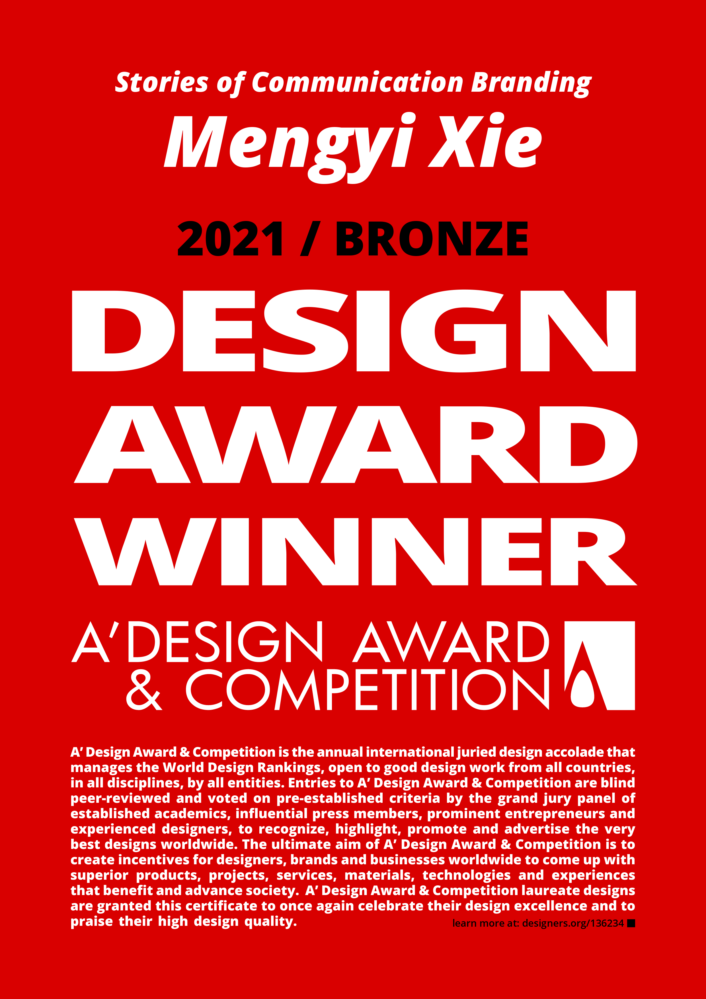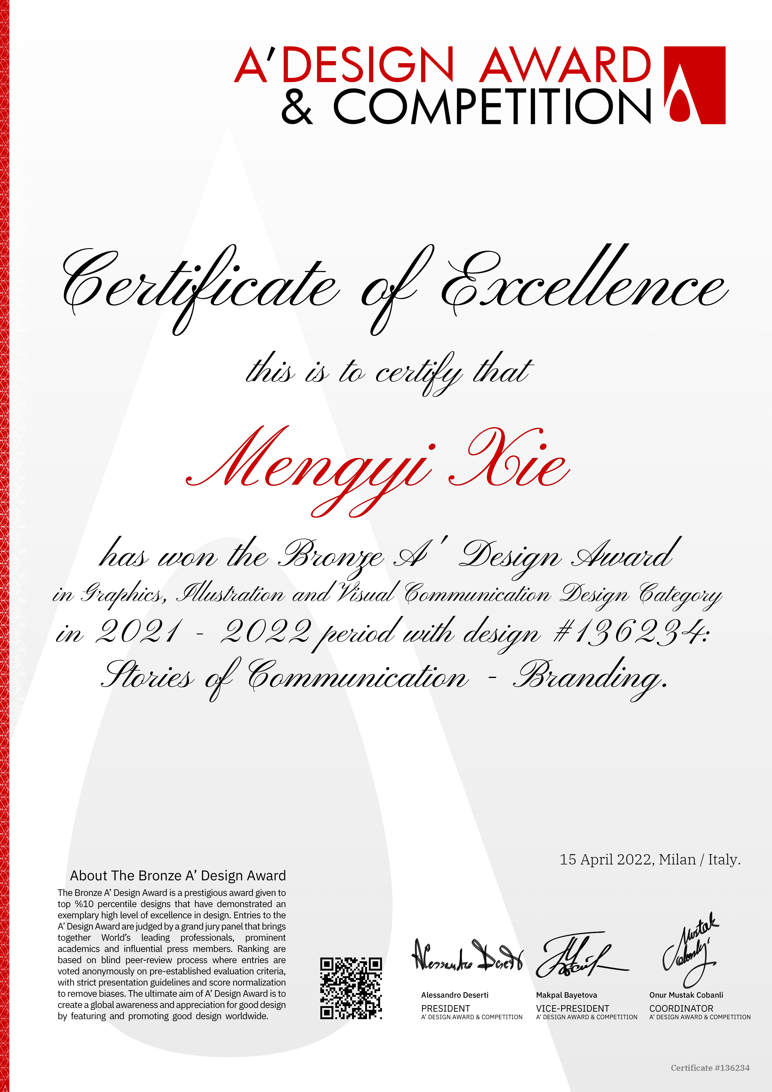 完美(中国)官方传播学院广告学系教师谢孟颐为传播学院建院15周年而作的视觉形象识别设计“Stories of Communication”(传播的故事),获2021-2022年意大利 A’ Design Award & Competition 设计奖铜奖。
