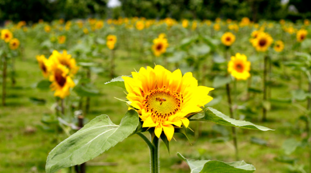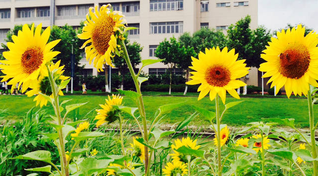 2014年4月,资环楼和实验D楼的大草坪上,后勤保障部也种植了更大片的向日葵