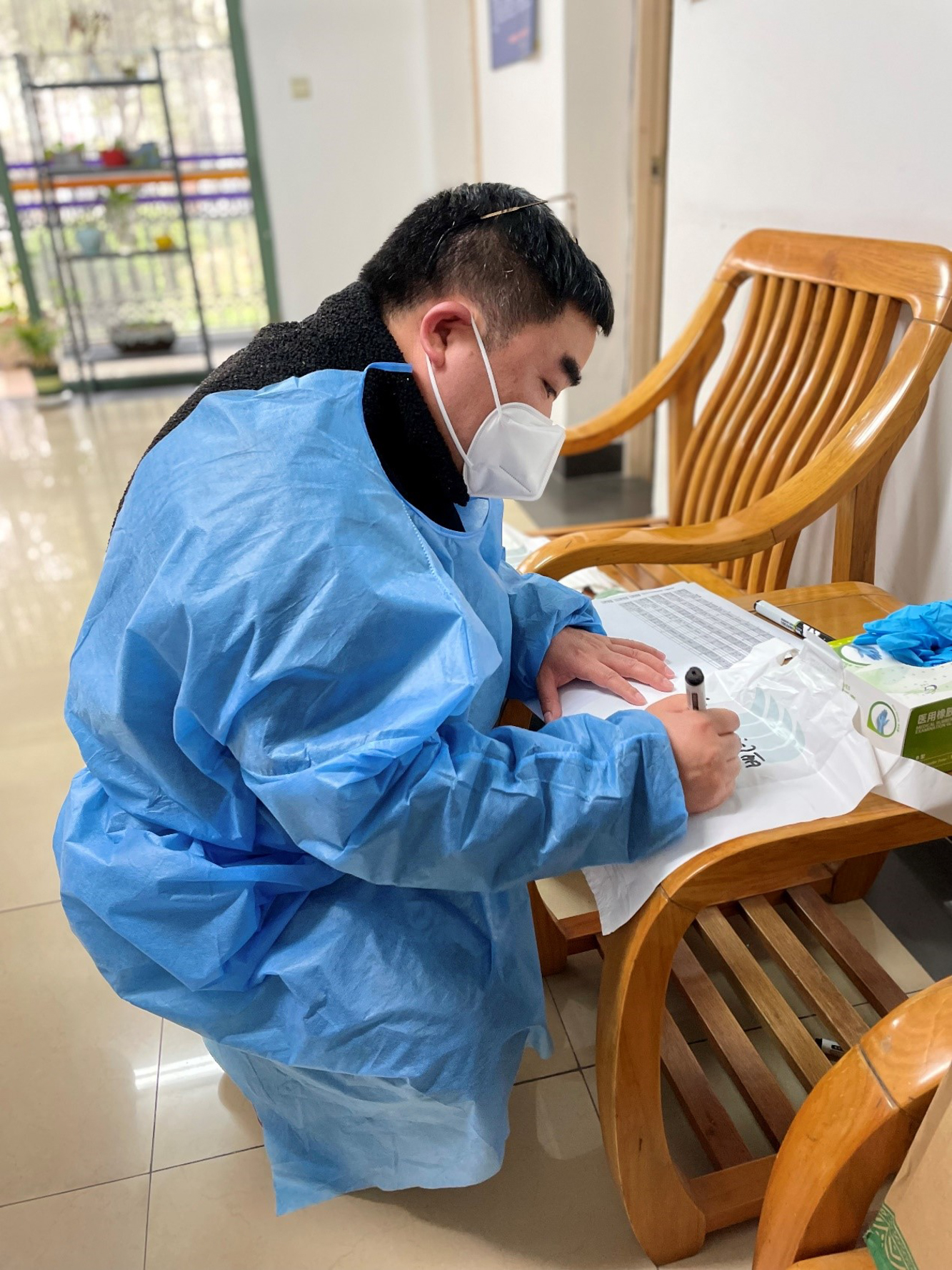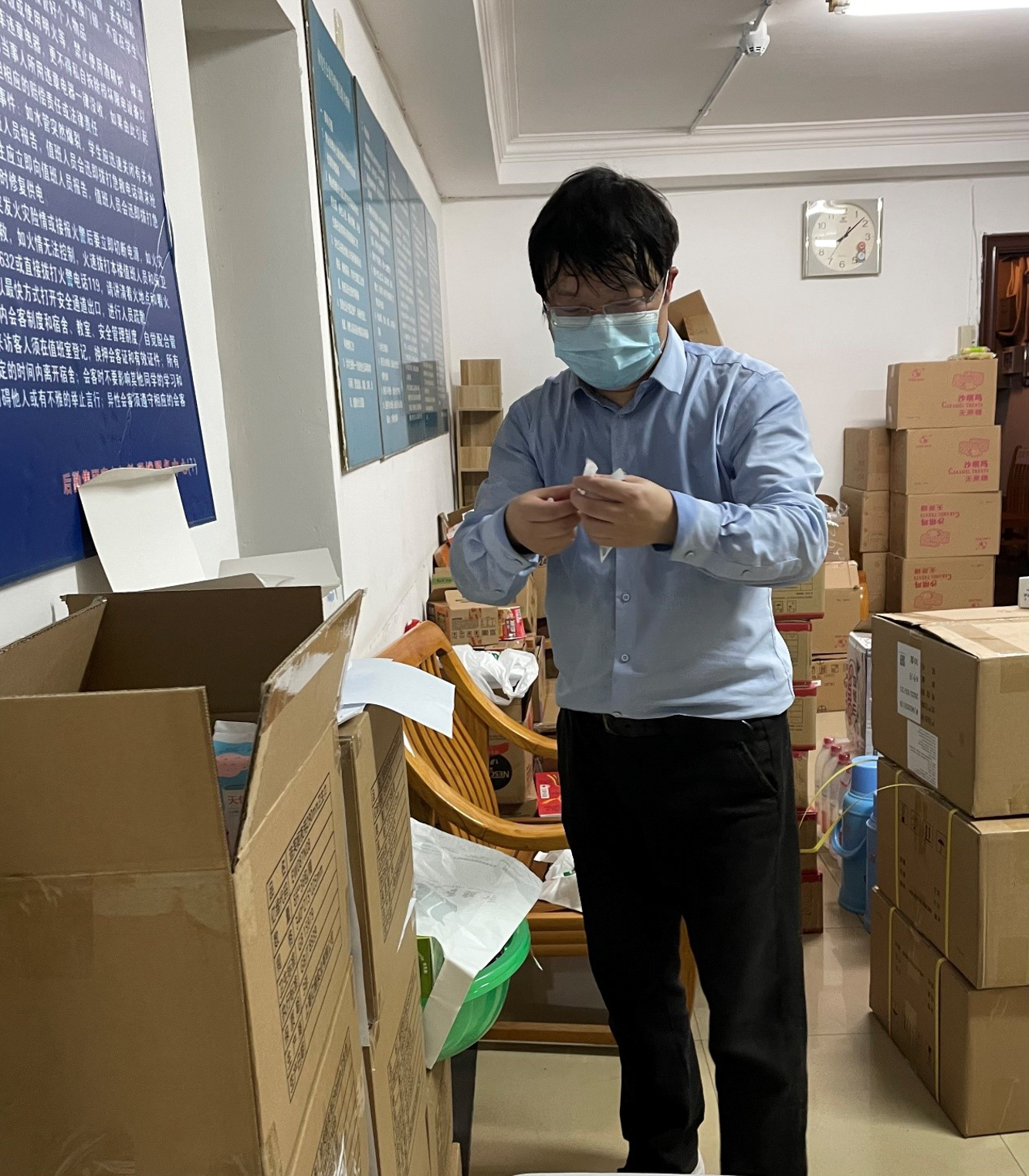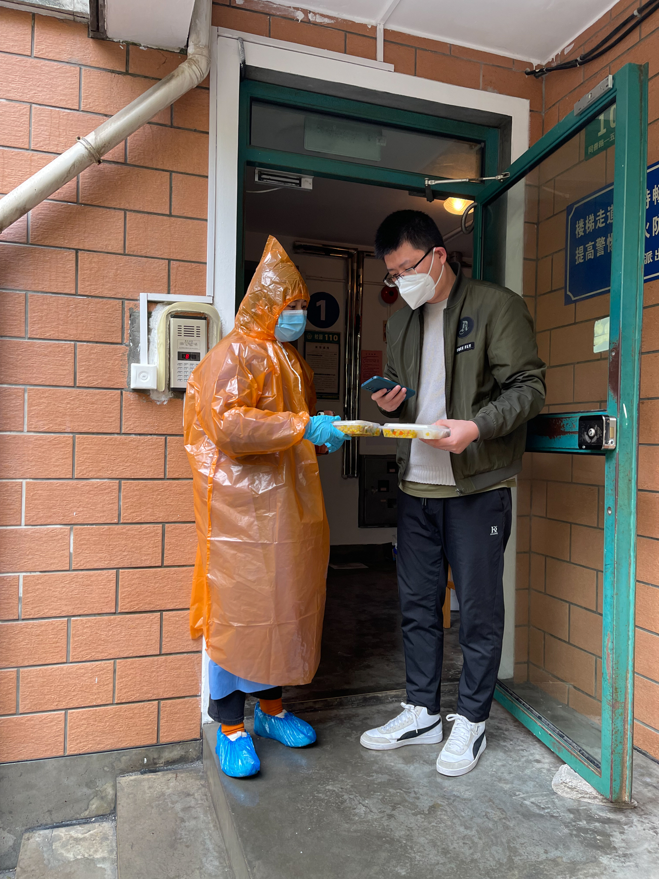 刚卸下大白,为核酸异常情况楼宇送餐归来的片区长黄曦老师