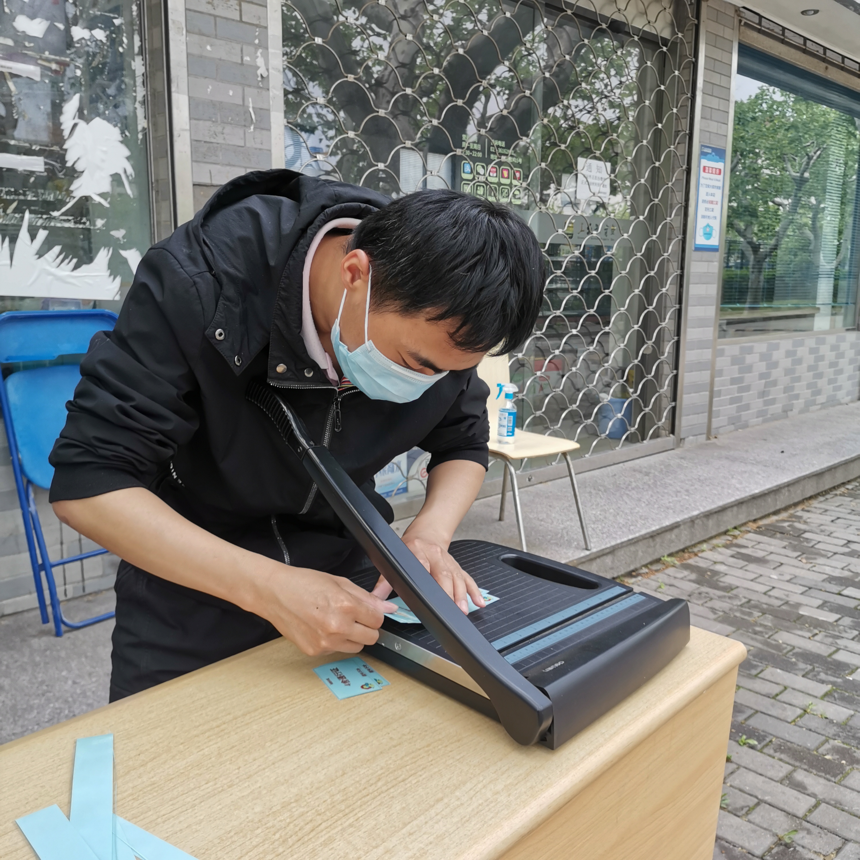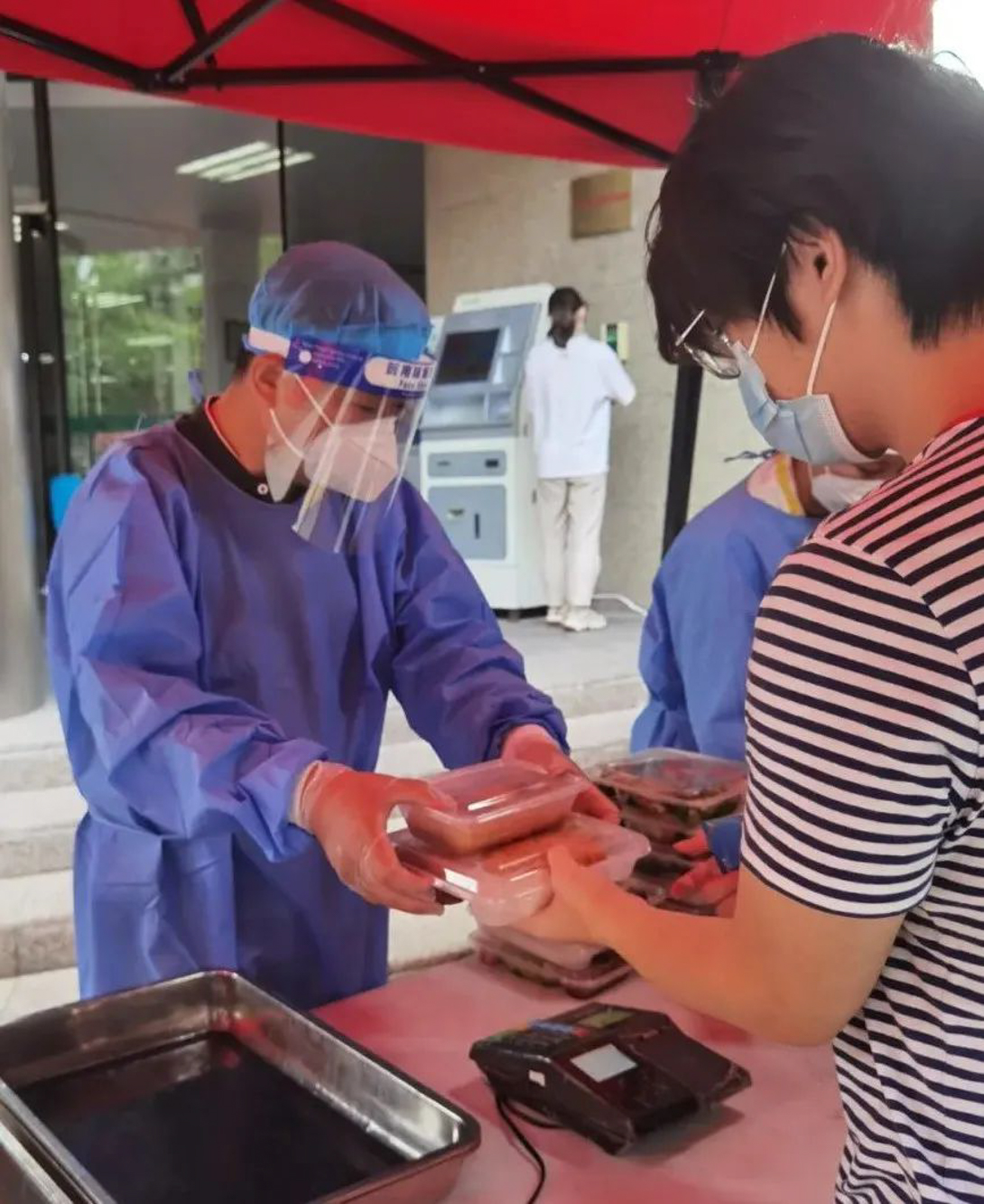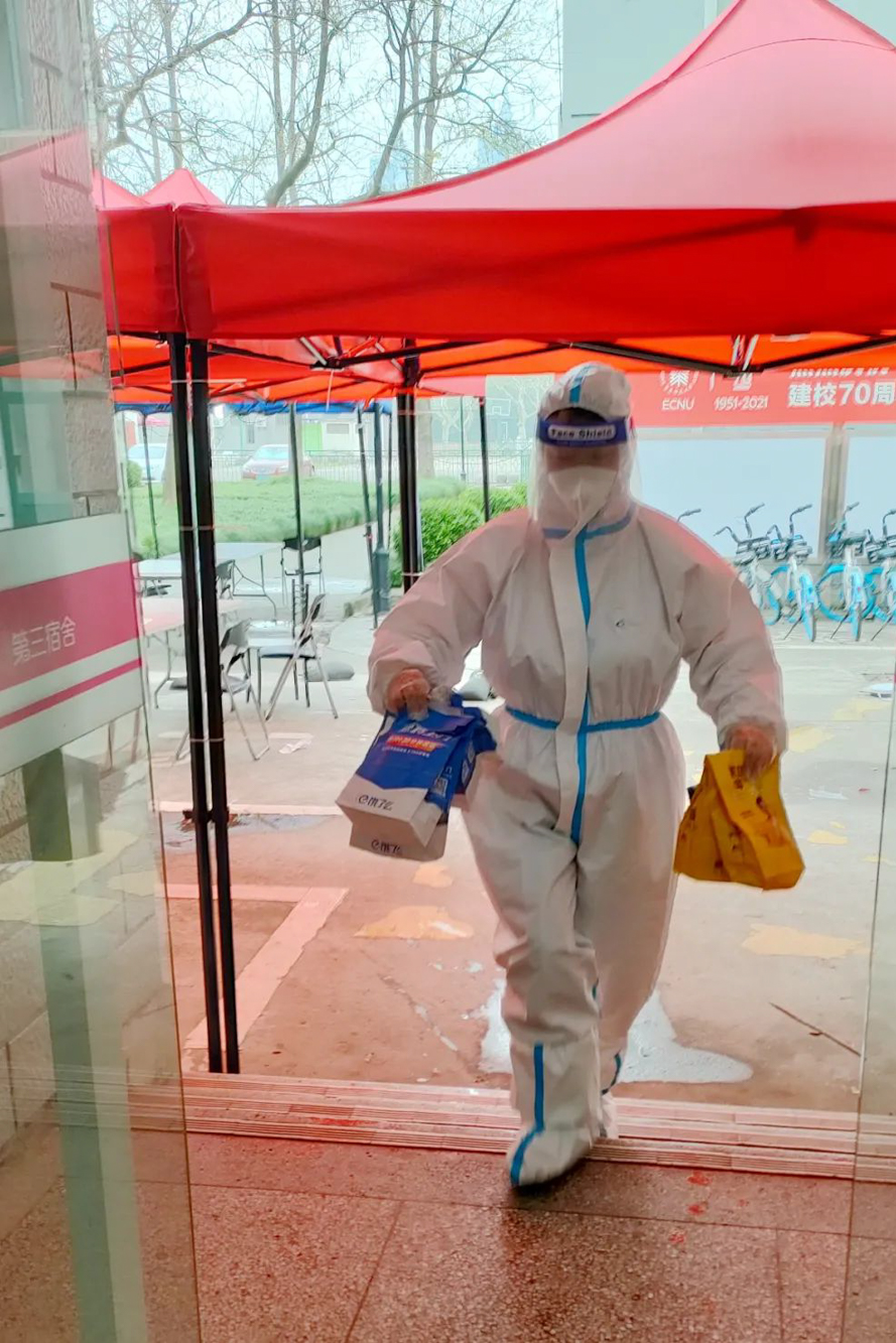 那天我在宿舍楼门口听到他的声音,因为穿着大白,不敢相认,我大声喊道:是你吗?薛寅申!他挥着臂膀:是啊!那刻,我一阵感慨:合作了一个多月的薛老师,此刻终于相见了!转头,他又和宿管阿姨们开始1300多份盒饭的搬运和分发工作。