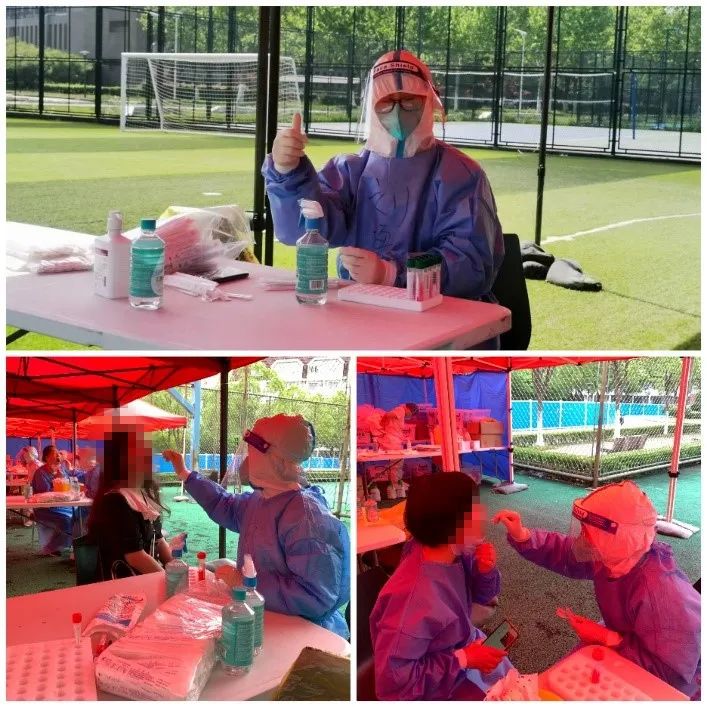 我们实验室工程师戴迪老师也在4月28日加入了学校核酸采样队。我在教研区被采样时遇到了我院的高亚敏和刘梅珍老师。现在学校的核酸采样已经井然有序,他们作战也已一个月余。他们效率非常高,每天都在各个片区工作。