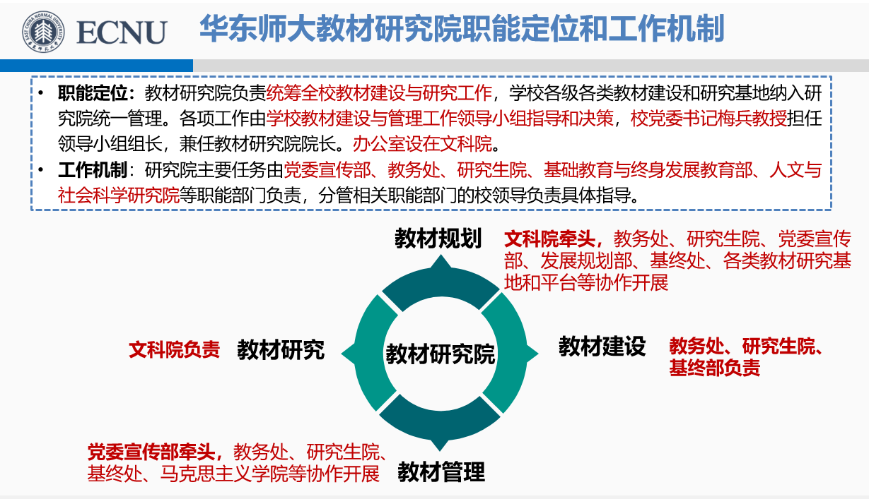 由于学校长期的积累,再加上十八大以来在教材方面的大量工作投入,我们取得了不俗的工作成效。在去年首届全国教材建设奖评选中获29项奖励,获奖数量排全国第四,国家级规划教材入选152种,首届上海精品教材获16项奖励;获批1家国家教材建设重点研究基地,6家教育部人文社科重点研究基地全部获得评估通过,获批10家上海高校“立德树人”人文社会科学重点研究基地、1家上海市教材政策研究中心;教育部教材局《普通高等学校教材管理办法》实施情况研究课题组也对我校教材建设和管理工作给予了充分肯定。