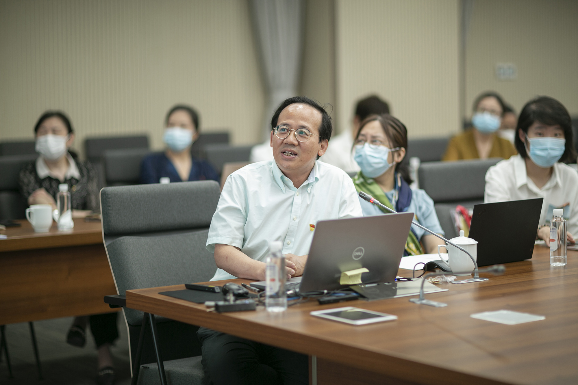 物理与电子科学学院党委书记李恺、经济与管理学部(经管书院)党委书记岳华分别介绍了疫情防控下发挥院系级党组织积极作用的生动案例和宝贵经验。李恺表示, “抓在平时、用在战时” 是关键,要筑牢基层党建的“硬堡垒”,提升思想引领的“软实力”,高配事业发展的“领头雁”,激发干事创业的“精气神”。学院及时制定在线教学预案,在线课程和实验广受好评;确保重大科研任务进度,相关研究成果发表在国际重要期刊,研制强力消杀机助力校园抗疫。岳华表示,突出责任担当,学部党委号召专业教师、辅导员等,驻守两个校区五个工作片区,充分发挥出支部战斗堡垒作用和党员干部先锋模范作用;强调工作统筹,齐心协力保障疫情防控下教育教学、就业等工作高质量开展。