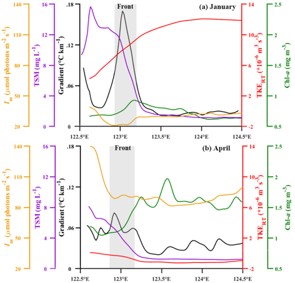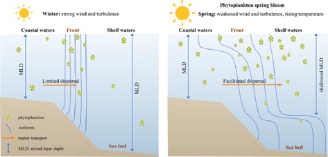 海洋锋面强度和结构的季节改变提高了水体稳定度,促使更浅混合层深度的形成与浮游植物在上层水体的聚积,同时加速了营养盐从近岸向陆架的输送,营造了引起浮游植物快速生长的光照与营养盐环境。陆架春季水华的起始时间对应着湍动能产生速率接近零的海洋环境条件,水华的量级与锋面结构的变化时间、程度,以及更弱湍流显著相关,包含了物理聚集与生物生长两个叠加过程。
