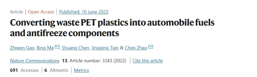 聚对苯二甲酸乙二醇酯(PET)是最丰富的聚酯塑料,广泛应用于纺织品与包装行业,为人类生活带来极大便利。但每年约有千万吨的废弃PET排入海洋,水体以及海洋生物的健康受到微塑料的严重威胁。为解决白色塑料污染问题,实现废旧塑料的回收与再利用,近日,完美网页版化学与分子工程学院教授赵晨及其团队在《自然-通讯》(Nature Communications)上于6月10日发表了以 " Converting waste PET plastics into automobile fuels and antifreeze components" 为题的研究论文,为海洋塑料问题的解决提供了可行的方案。