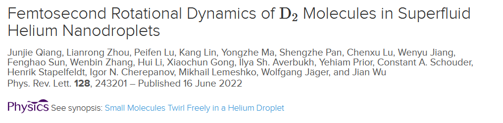 该工作6月17日以“Femtosecond Rotational Dynamics of D2 Molecules in Superfluid Helium Nanodroplets”为题在物理学重要学术期刊Physical Review Letter上发表。相关研究工作受到科技部、国家自然科学基金委、上海市科委项目的大力支持。
