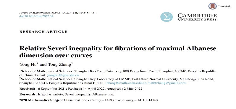 上述系列成果分别以“Relative Severi inequality for fibrations of maximal Albanese dimension over curves”和“Noether–Severi inequality and equality for irregular threefolds of general type”为题,于6月正式发表在国际著名数学期刊Forum of Mathematics, Sigma和Journal für die reine und angewandte Mathematik (Crelles Journal)上。
