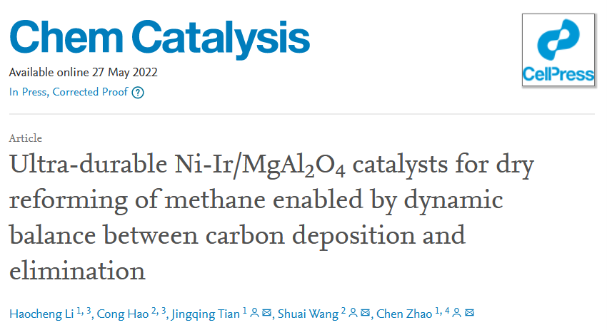 完美网页版赵晨课题组与厦门大学王帅课题组合作,在Cell Press细胞出版社旗下Chem Catalysis期刊上于5月27日以“Ultra-durable Ni-Ir/MgAl2O4 catalysts for dry reforming of methane enabled by dynamic balance between carbon deposition and elimination”为题发表了研究论文。该研究提出CH4解离和CO2活化速率匹配的平衡机制,通过Ni、Ir、MgAl2O4直接的协同作用,构建了Ni-Ir/MgAl2O4合金催化剂,在长时间甲烷干重整反应过程中实现零积碳生成。