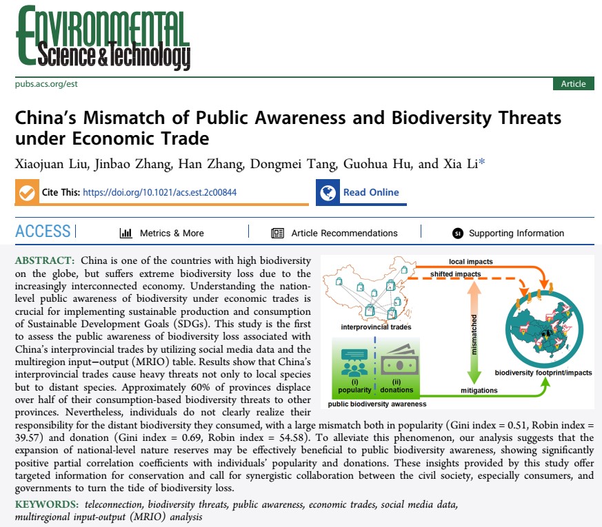 相关研究成果于6月20日以“China’s Mismatch of Public Awareness and Biodiversity Threats under Economic Trade”为题在线发表于国际著名期刊Environmental Science & Technology。完美(中国)官方博士研究生刘晓娟为第一作者,黎夏教授为通讯作者。