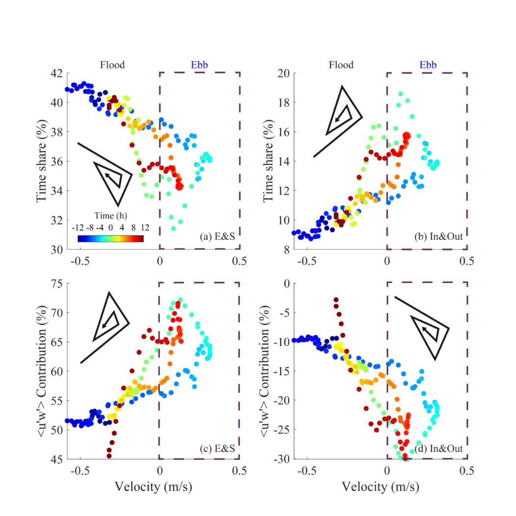 论文揭示了在不规则半日潮海区底边界层内湍流相干结构的潮周期性变化特征:随着一日内潮汐过程的发展,四个象限的时间占比(Time share)与雷诺应力贡献(<u’w’> contribution)发生了周期性的变化。研究还指出,湍流能量生成耗散的不平衡对湍流相干结构起到了重要的控制作用。落潮期间,更高的耗散率导致Inward与Outward事件的时间占比增加,进而引起对雷诺应力贡献的周期性变化。