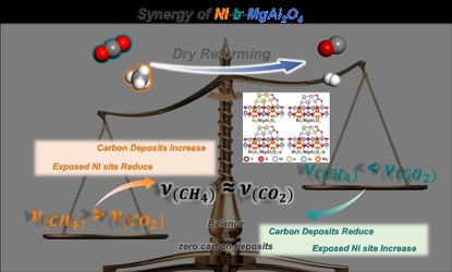 甲烷干重整(DRM)是生产合成气(CO和H2的混合物)的主要方法,而合成气是燃料和化学品工业生产的关键平台物质,可通过下游反应生产烷烃、烯烃、芳烃、醇类等多种化工中间体和原料。在高温反应过程中,催化剂存在严重的积碳和金属烧结问题,这限制了其大规模应用。研究者都致力于探究零积碳的催化剂体系以得到长寿命的甲烷重整催化体系,而解决这一问题的核心是建立催化剂表面上的CH4解离和CO2活化之间有效的平衡。