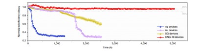 最终,该团队制备的钙钛矿器件获得了24%以上的高效率,在连续光照条件下工作5000小时后效率几乎不衰减。该项成果为钙钛矿太阳电池的电极设计提供了新的思路,对于推进钙钛矿太阳电池产业化具有重要意义。