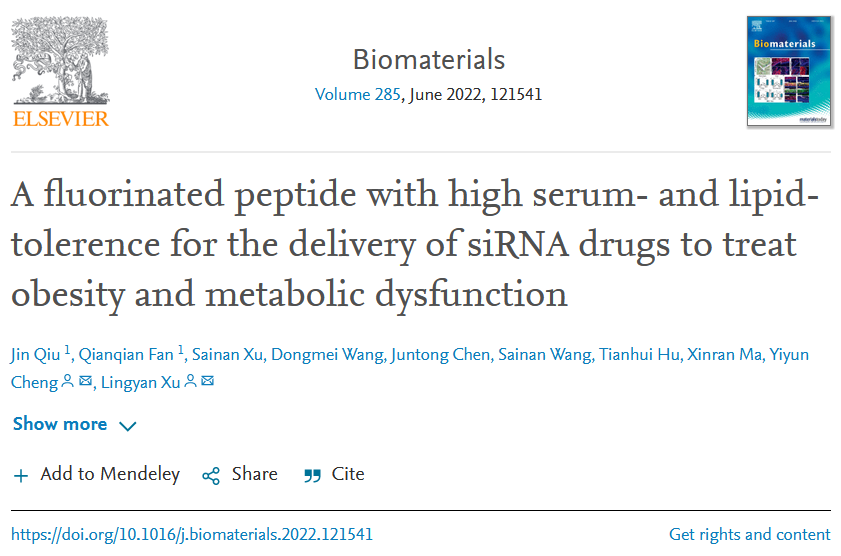 相关研究成果以“A fluorinated peptide with high serum- and lipid-tolerence for the delivery of siRNA drugs to treat obesity and metabolic dysfunction”为题4月28日在线发表于国际生物材料领域顶级期刊Biomaterials。