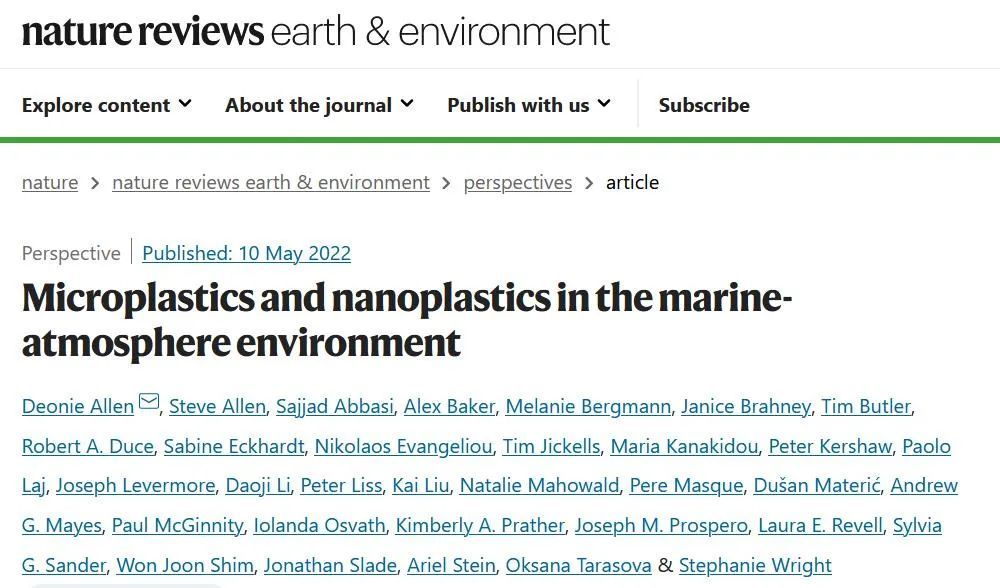 5月10日,《自然》子刊《自然综述:地球与环境》(Nature Reviews Earth & Environment)发表了海洋-大气环境中微(纳米)塑料研究重要进展文章。这篇前瞻性论文汇集了33位大气科学、海洋科学和塑料污染方面的国际专家的成果和观点,强调了将海洋-大气传输纳入整个塑料循环研究的重要性。