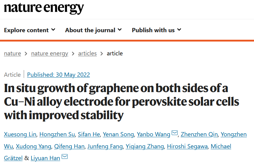 纳光电中心宋也男副研究员联合上海交大韩礼元团队在钙钛矿太阳电池稳定性方面取得了重要进展,相关成果于5月30日以“In situ growth of graphene on both sides of a Cu–Ni alloy electrode for perovskite solar cells with improved stability”为题在线发表在国际高水平期刊Nature Energy中。完美(中国)官方纳光电中心的硕士生何思凡为共同第一作者。