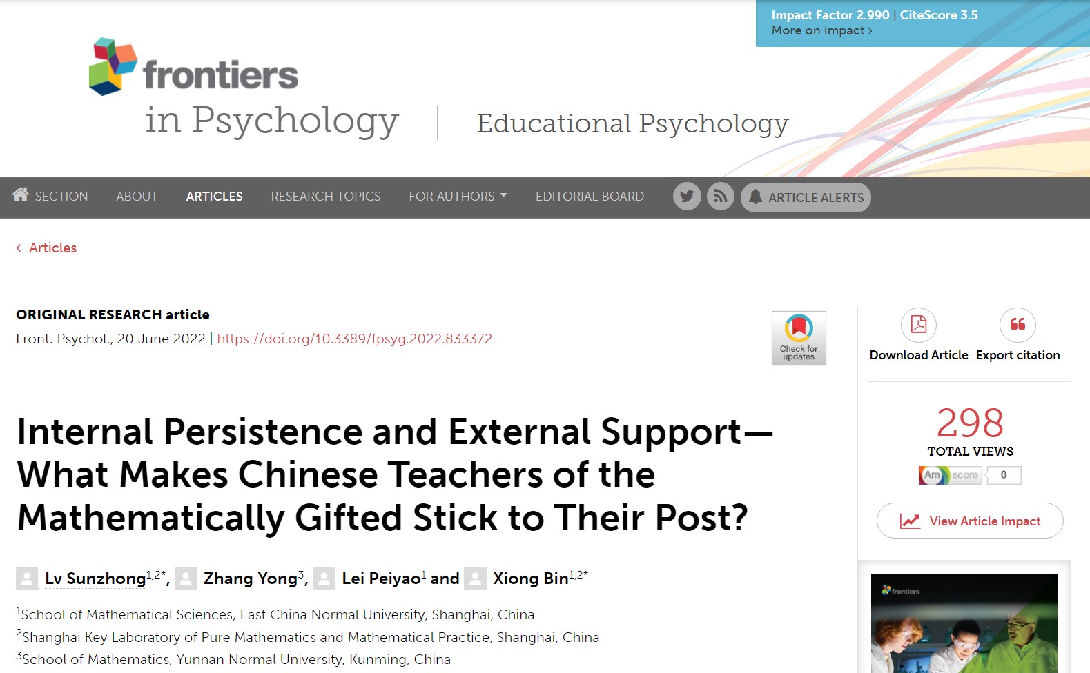 近日,数学科学学院熊斌教授团队以4位杰出的中国数学竞赛教师为个案,通过半结构化的深度访谈收集数据,采用基于双因素模型的主题分析法分析了这4位教师为何能在该领域坚持20多年。研究表明,影响留任的主要内部因素为认可、成就感、自身成长、工作本身和责任感,外部因素为政策和人际关系。相关研究成果“Internal Persistence and External Support—What Makes Chinese Teachers of the Mathematically Gifted Stick to Their Post?”于6月20日在线发表于国际著名心理学期刊Frontiers in Psychology。