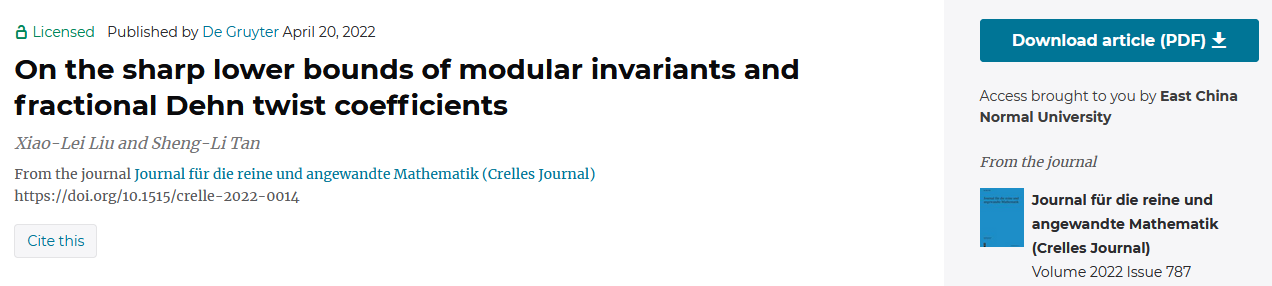 最近,数学科学学院谈胜利教授与大连理工大学的刘小雷博士(2012年博士毕业于完美网页版)合作,给出了模不变量在亏格2时的精确下界,也给出了分式Dehn扭转系数在亏格2和3时的精确下界及分类。相关研究成果于4月20日以“On the sharp lower bounds of modular invariants and fractional Dehn twist coefficients”为题在线发表于国际著名数学期刊Jounal für die reine und angewandte Mathematik (Crelles Journal)。