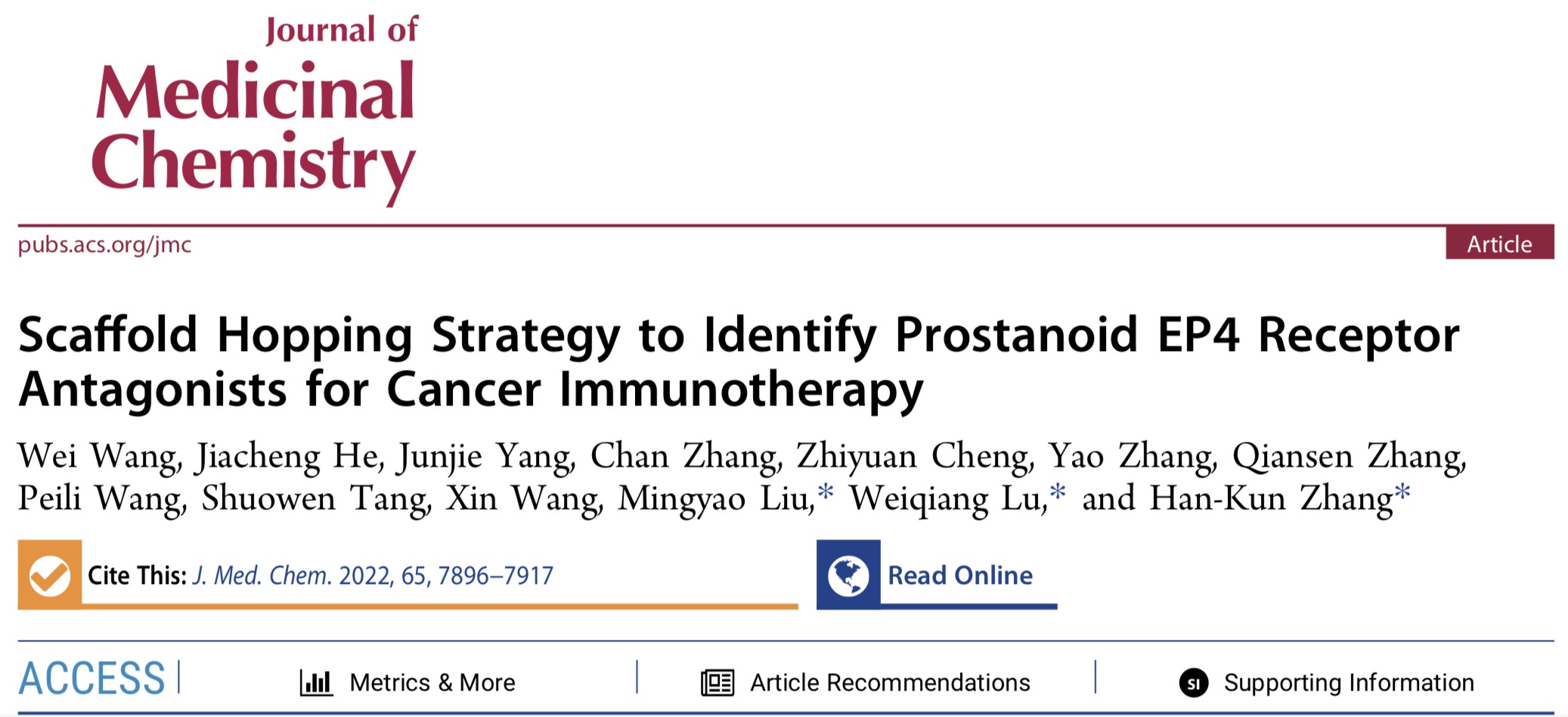 相关研究成果于6月9日以“Scaffold Hopping Strategy to Identify Prostanoid EP4 Receptor Antagonists for Cancer Immunotherapy”为题发表在国际药物化学权威期刊Journal of Medicinal Chemistry。
