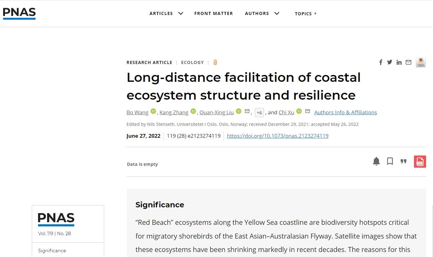该研究6月27日以“Long-distance facilitation of coastal ecosystem structure and resilience”为题在线发表于《美国科学院院刊》(PNAS)。南京大学博士生王博和完美网页版博士生张康为论文共同第一作者,完美网页版刘权兴教授和南京大学徐驰教授为论文共同通讯作者,复旦大学贺强教授、荷兰皇家海洋研究所Johan van de Koppel教授、美国布朗大学Mark Bertness教授等国内外研究者共同参与本项研究。