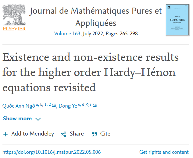 数学科学学院叶东教授和他的越南合作者Ngo在论文“Existence and non-existence results for the higher order Hardy-Hénon equations revisited”中,采用与近十年该问题的主流研究不同的思路,另辟蹊径,通过考虑分布意义下弱解的存在性、积分表达以及多重上调和性质、弱解和经典解的联系,得到了n≥2m>-σ,p>1时全空间经典正解存在性的完整刻画。这一研究成果今年5月14日在线发表于Joseph Liouville 1836年创办的国际著名数学期刊Journal de Mathématiques Pures et Appliquées。