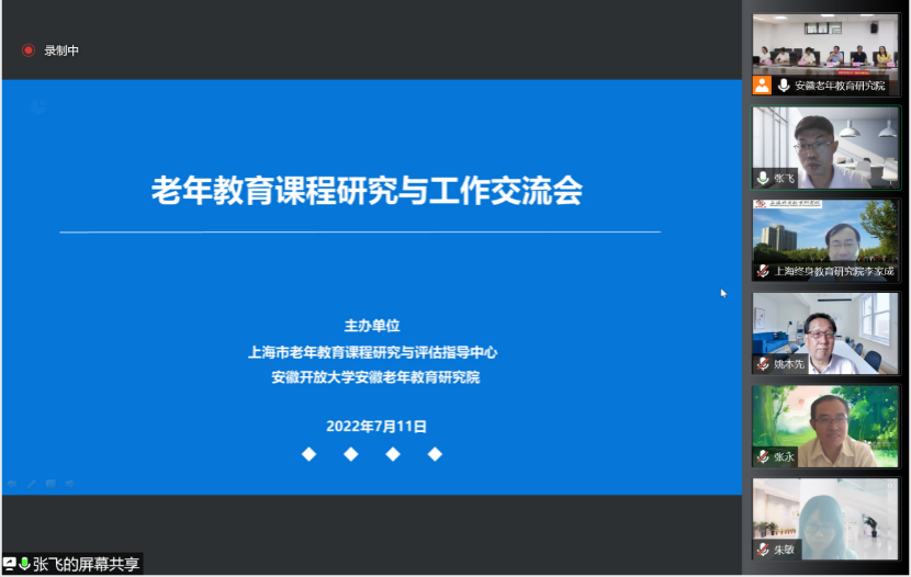 7月11日下午,由上海市老年教育课程研究与评估指导中心、安徽开放大学安徽老年教育研究院联合主办的“老年教育课程研究与工作交流会”通过腾讯会议平台在线召开。安徽老年开放大学校长、安徽老年教育研究院常务副院长方文,安徽老年教育研究院研究员、开放教育学院院长刘盛峰,安徽老年教育研究院副院长江丽,安徽老年教育研究院学术研究部主任张飞,安徽老年教育研究院研究员姚本先,安徽老年教育研究院学术研究部教师杨桂美,安徽老年开放大学教学教务管理部主任郭玉娟,安徽老年远程教育研究团队研究人员谭冉,安徽老年远程教育办公室教师曹颖,安徽老年教育研究院学术研究部教师李琦;上海市老年教育课程研究与评估指导中心副主任裴建华、李家成,中心研究室主任张永、马丽华、朱敏、徐敏华,中心成员黄莹、唐迪;以及安徽老年教育研究院其它研究人员、完美(中国)官方职业教育与成人教育研究所硕博士生参会。本次交流会由安徽老年教育研究院学术研究部主任张飞主持。