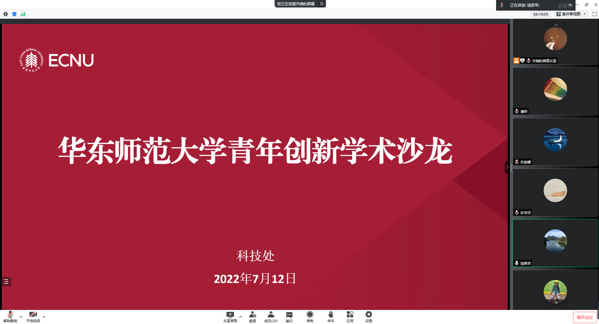 在交流讨论环节,来自化学与分子工程学院的王威、王辰,精密光谱科学与技术国家重点实验室的倪宏程、李林、孙政,软件工程学院的巩俊卿,物理与电子科学学院的陈斌斌,数据科学与工程学院的郭晨娟,通信与电子工程学院的王妍等九位青年科研人员分别介绍了自己的研究内容和研究成果,并提出了希望开展交叉合作研究的领域和方向。