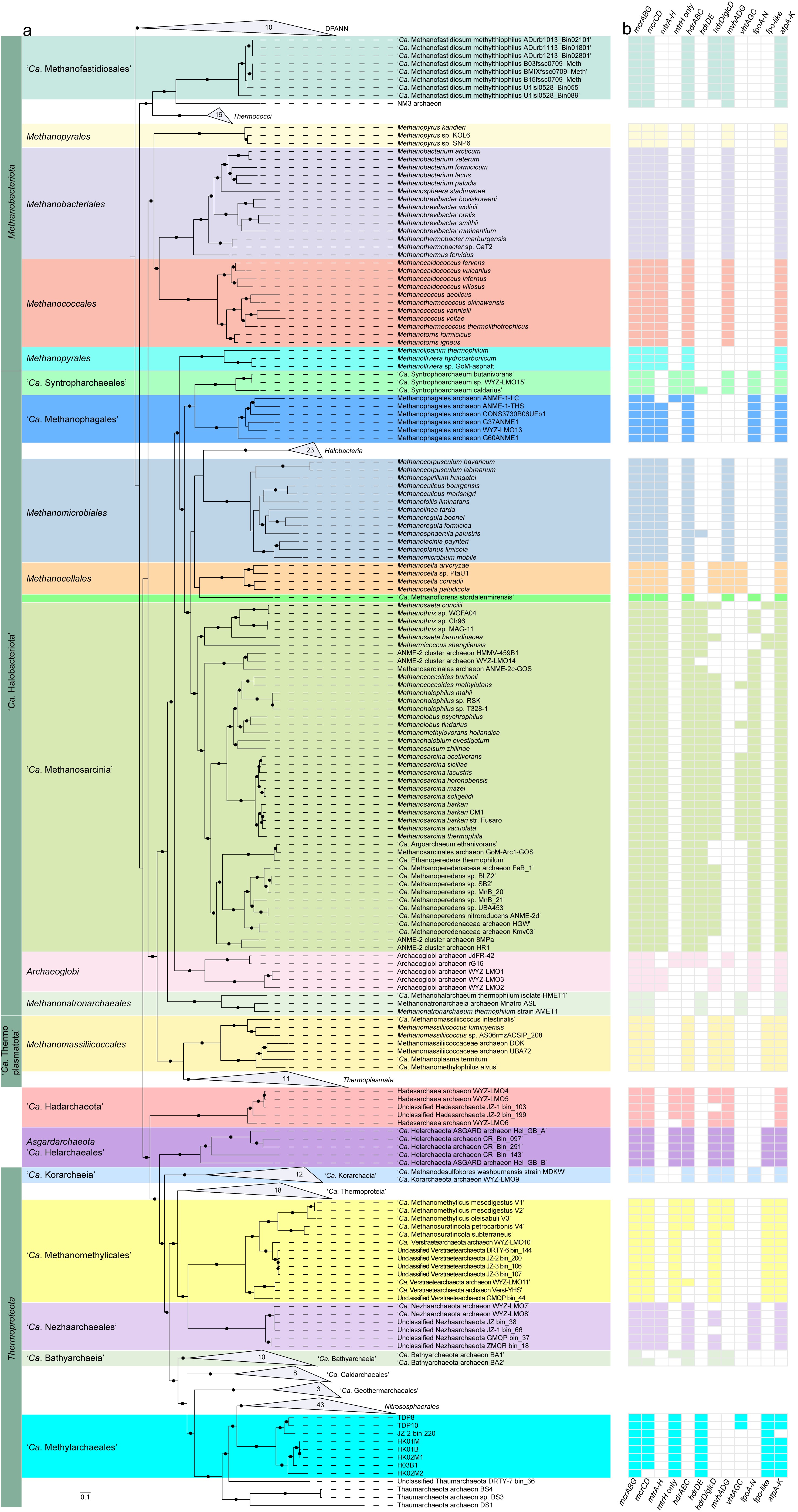 图1. 新发现的Methylarchaeales目在古菌中的进化地位(a 串联122个古菌标志蛋白进化树;b 甲烷代谢关键基因分布)