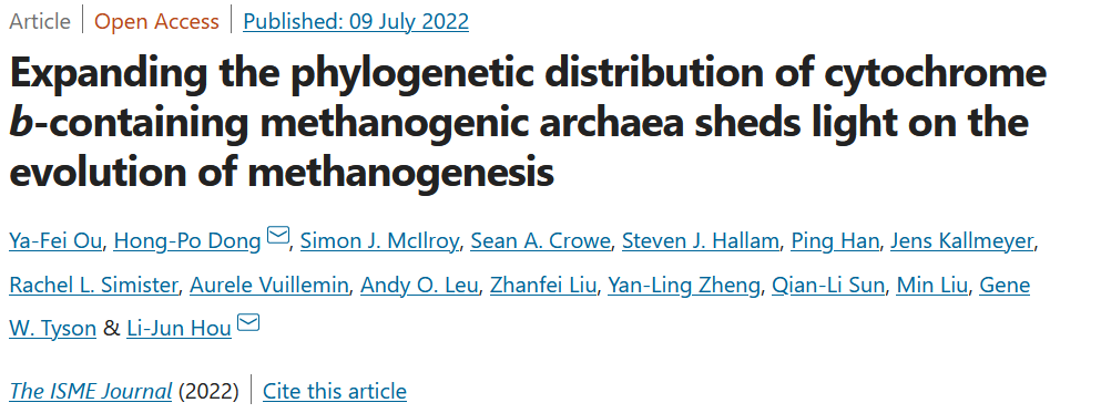 相关工作于7月9日以 Expanding the phylogenetic distribution of cytochrome b-containing methanogenic archaea sheds light on the evolution of methanogenesis 为题在线发表在 Nature 旗下学术刊物 The ISME Journal (2022, https://www.nature.com/articles/s41396-022-01281-0)。完美(中国)官方河口海岸学国家重点实验室为该研究成果第一单位,博士生欧亚飞为第一作者,董宏坡研究员和侯立军研究员为共同通讯作者。本研究得到了国家自然科学基金和科技部重点研发计划项目的资助。