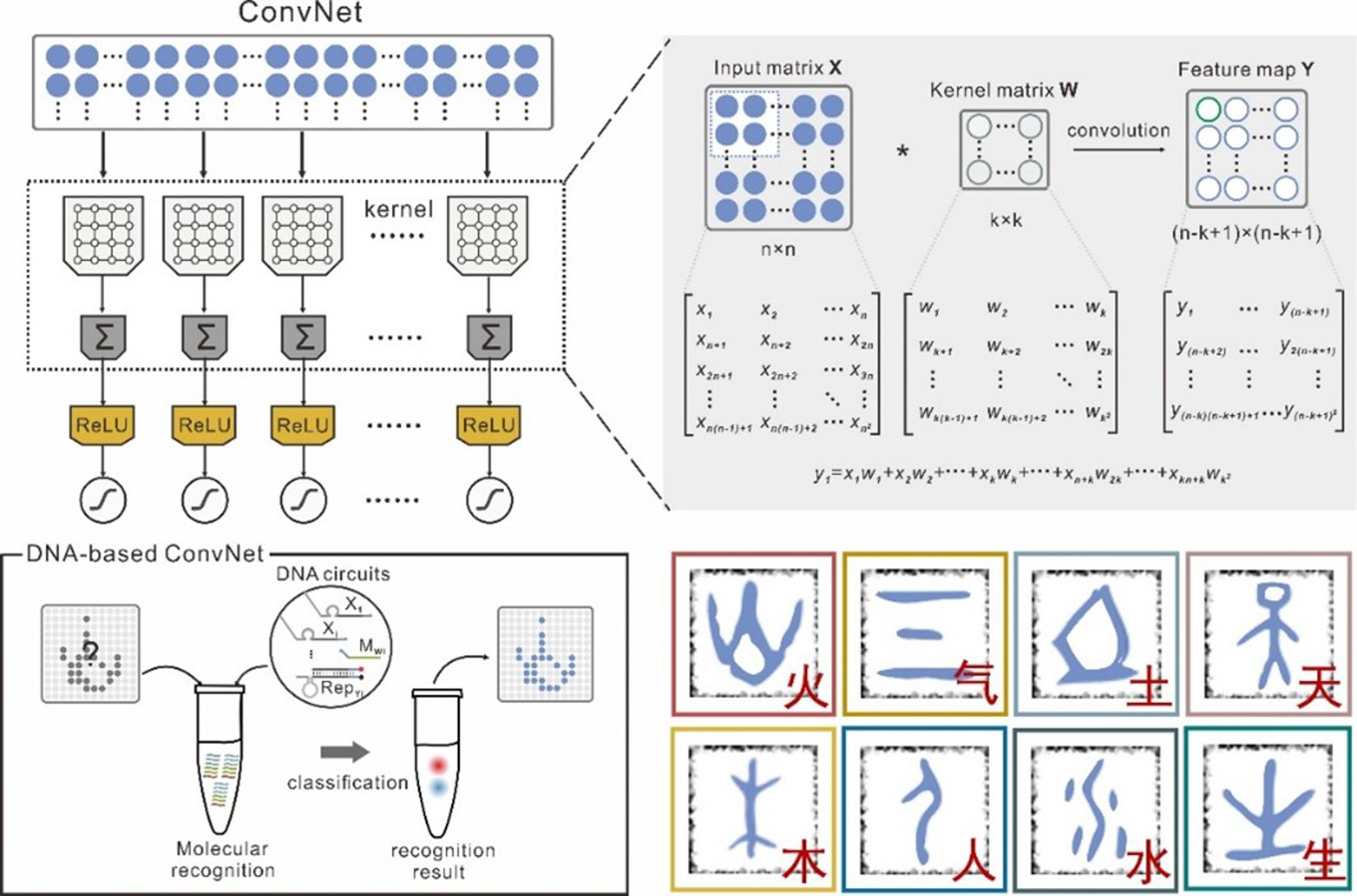 为验证DNA的神经网络的能力,课题组选择了电子人工神经网络的一个经典挑战——识别字迹作为任务。通过DNA分子构建的卷积神经网络进行规定的化学反应,可完成4种语言及32种手写文字的分类,包括对中国甲骨文字(火、土、木、水、天、气、人、生)的分类识别。“分子字迹”的准确识别,充分说明了所构建的DNA神经网络具有强大的分子图谱信息处理能力,有望进一步在智能生物传感及载药等领域得以应用。