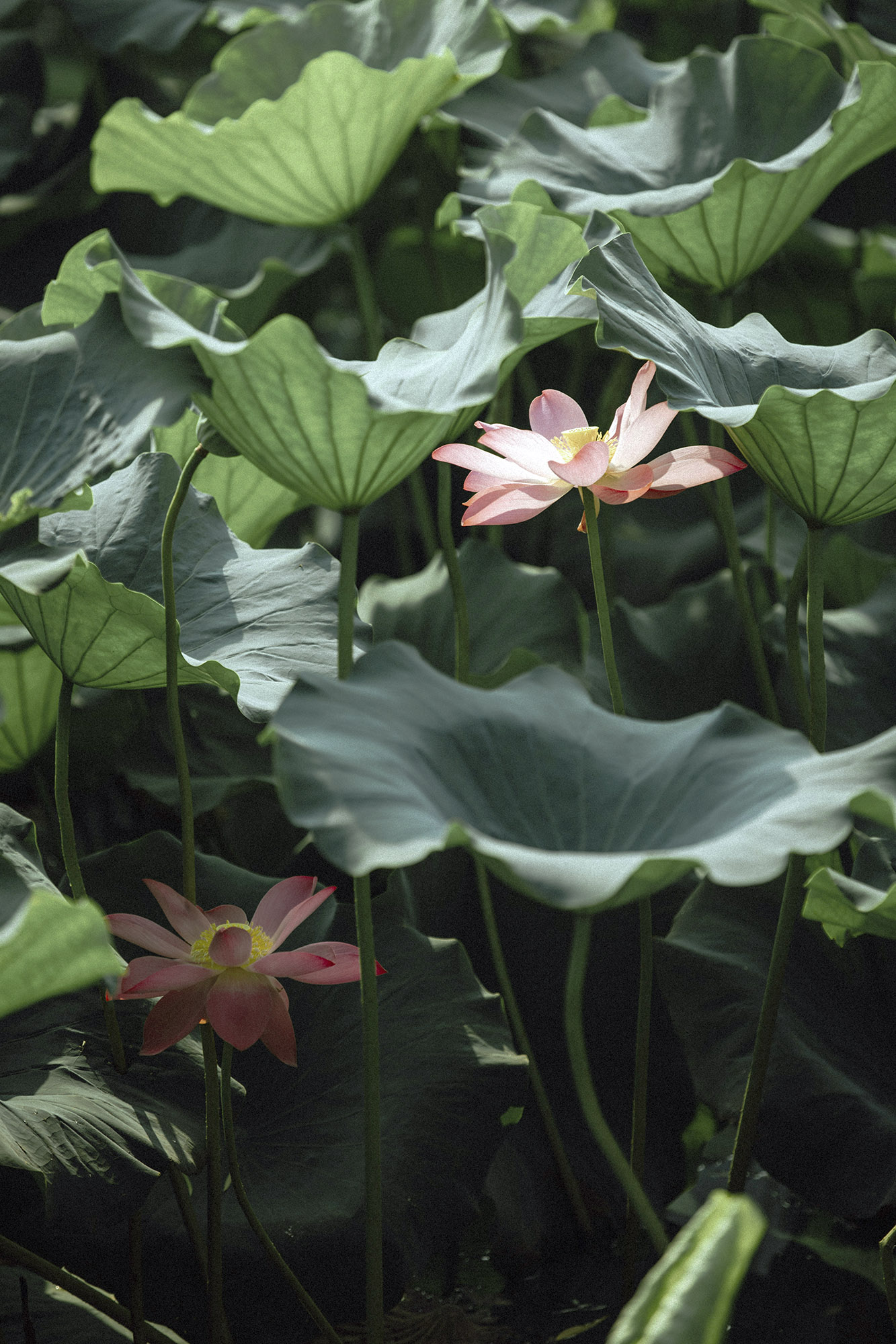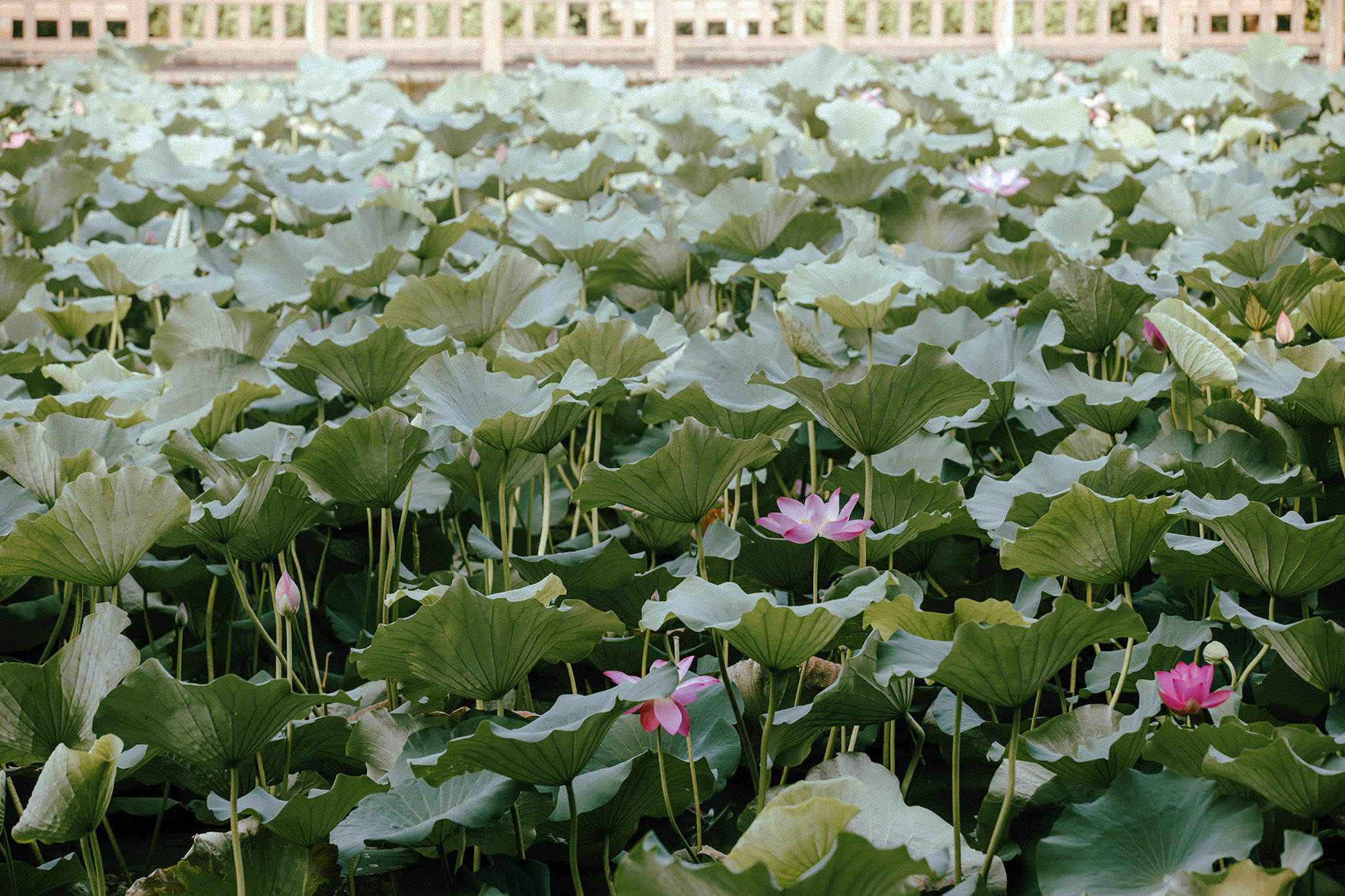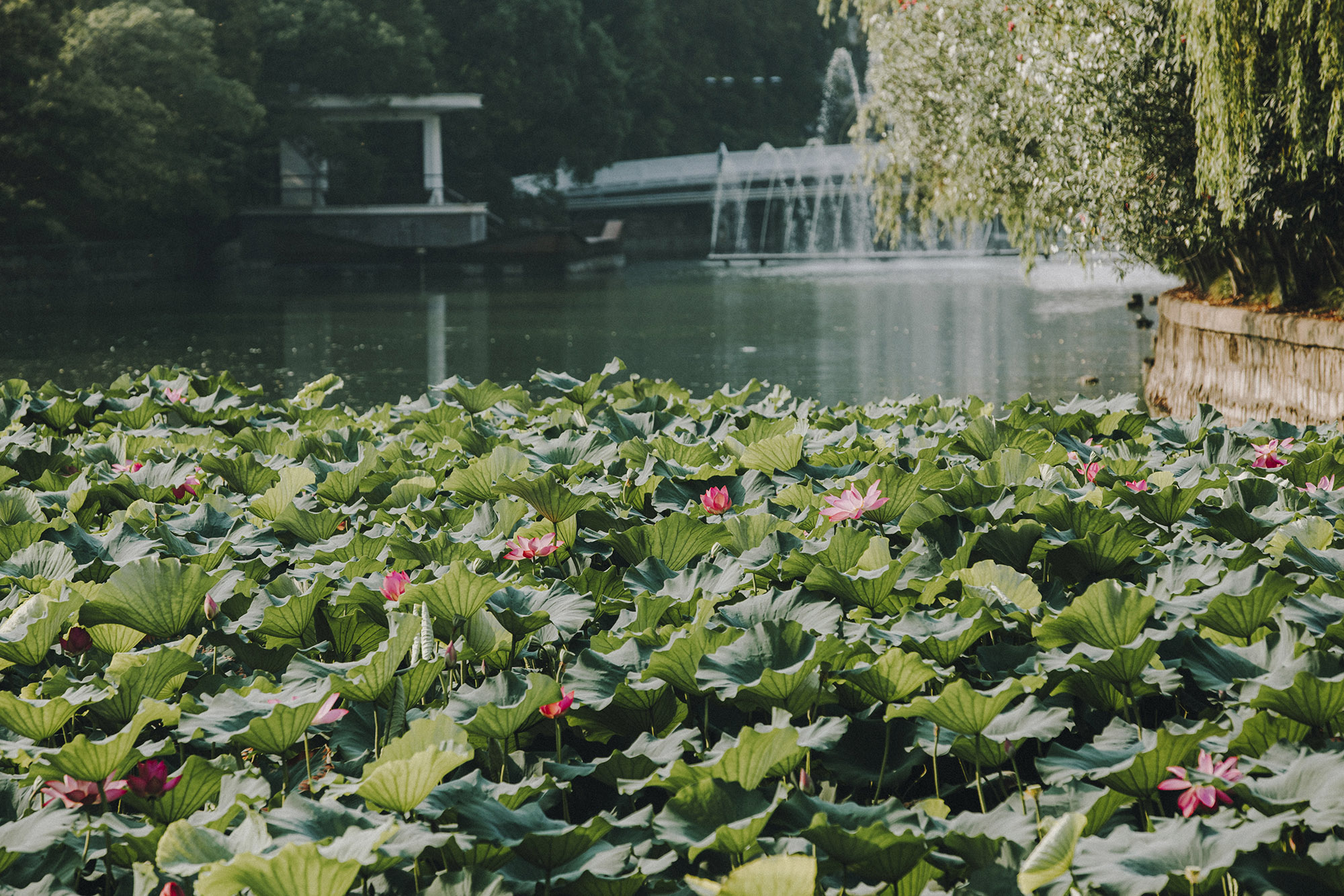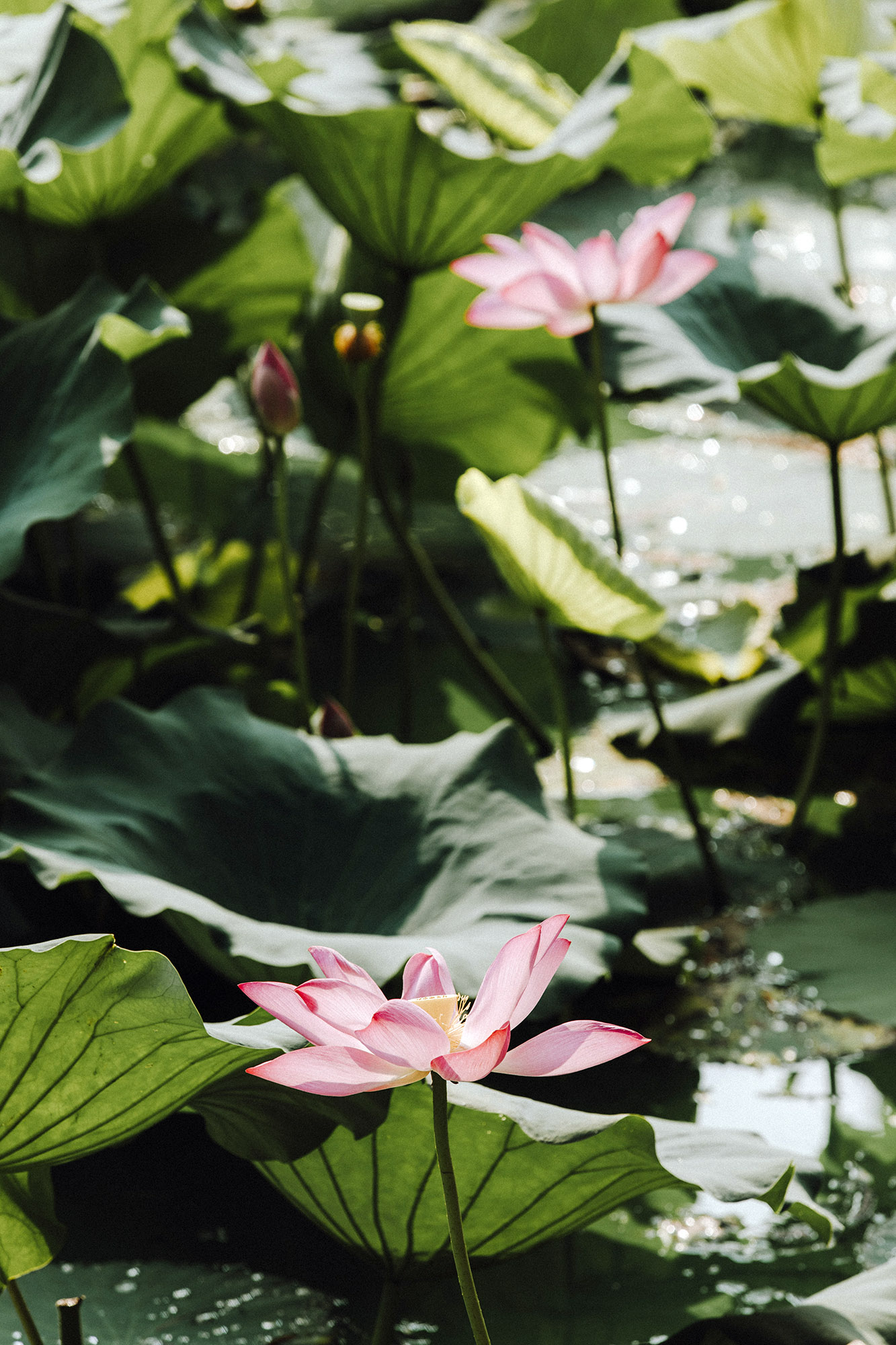 “青荷盖绿水 芙蓉披红鲜”,丽娃河中的荷花开得正盛。连天碧叶中掩映着深深浅浅的粉。薄施粉黛,艳抹浓妆,总是相宜。
