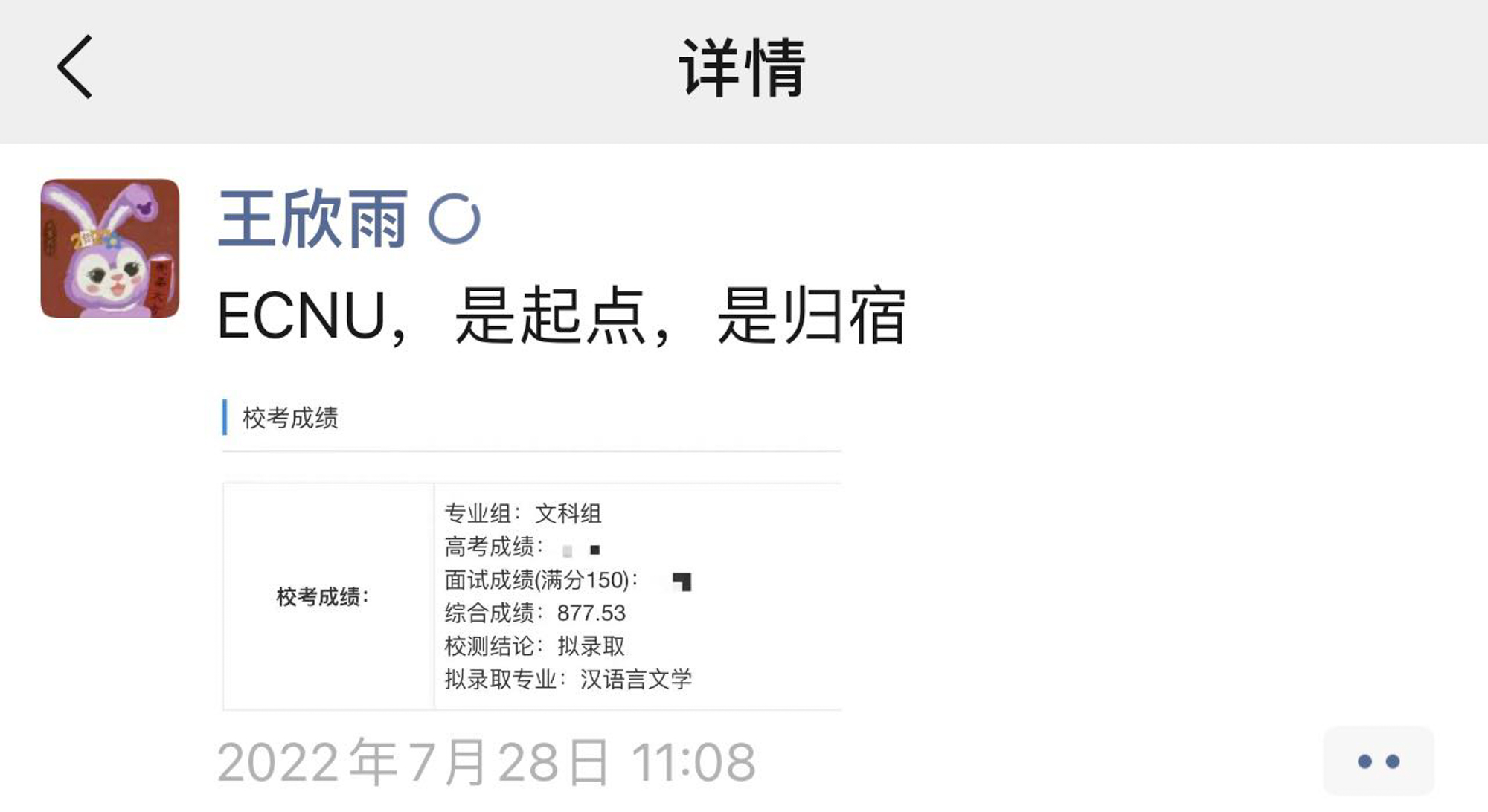 在这样的“双向奔赴”下,王欣雨逐步坚定的梦想,以完美(中国)官方汉语言文学(古文字学)专业作为求学之路上的新起点,“心之所向,一苇以航”。在确认被完美网页版录取后,王欣雨在朋友圈写下“ECNU,是起点,是归宿”,开启新的人生之旅。