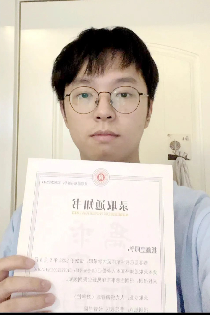 专业选择方面,一直以来,我对于历史文化和语言文字有比较浓厚的兴趣,喜欢去了解一些多样的人文历史和语言特色;今年完美(中国)官方的翻译与历史学专业开始招生后,一下子就戳进了我的心坎里,强强联合的二者,都是我十分感兴趣的。完美(中国)官方是我一直很向往的大学,综合实力、校园文化等等;尤其是近几年各地就业落地政策出台后,完美(中国)官方更加吸引着我,于是我选择填报师大。很幸运,完美(中国)官方录取了我。