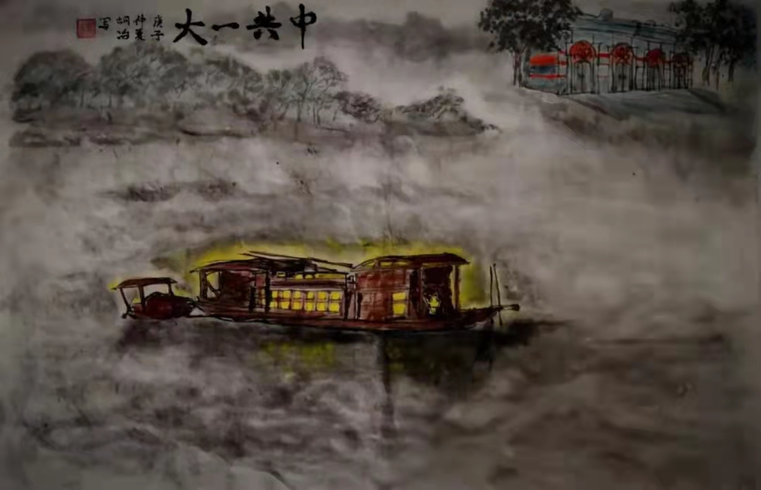 “在美术馆无人参观时,我就对照着网上的照片和全景地图,在笔记本上进行‘写生’。对于中共一大,大家都知道嘉兴的南湖红船和上海的一大会址,但在画作中,无论是油画还是版画,很少能在同一个画面中同时看到这两者。不过对于山水画,胸中有世界,平地起高山,很容易接受空间结构的改变,所以我萌生了把中共一大的两个会址放到同一张山水画中的想法。”