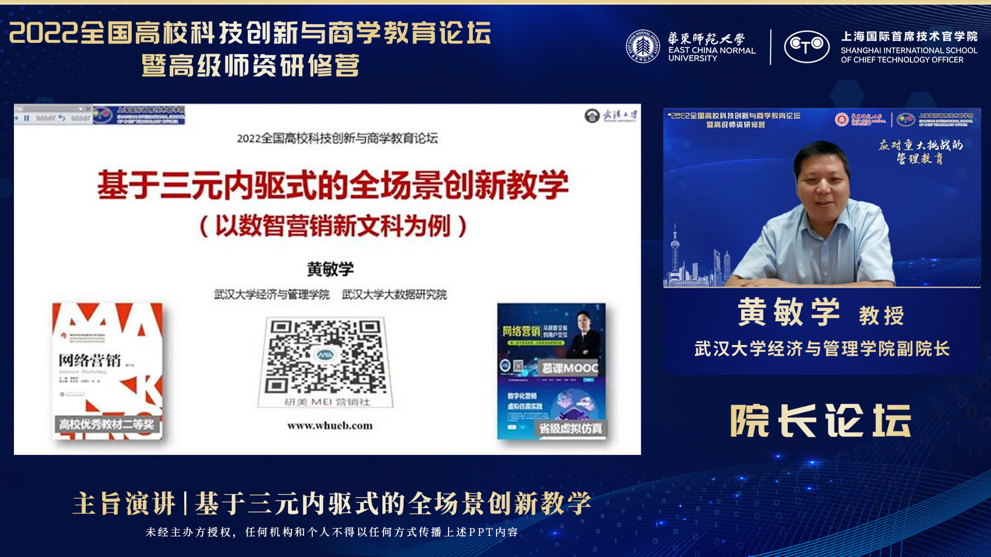 武汉大学经济与管理学院副院长黄敏学教授作了题为“基于三元内驱式的全场景创新教学”的主旨演讲。他从数智时代营销与技术的关系、营销岗位能力要求变化、营销人才培养模式创新,层层递进,为与会人员介绍了数智时代营销专业课程体系的挑战和机遇。黄敏学从技术驱动、理论创新两个维度对营销的历史变化进行梳理,指出营销模式正从大众标准化转变到全景响应式,以大数据驱动的智能影响决策与管理具有研究数字化、消费社群化、策略场景化、创业场景化、执行智能化五种全新的特征和形式。进一步地,他提出市场营销岗位的要求正从认知向能力转型,提出让学生“想学”“有学”“能学”,用三元内驱模式进行教学,从而培养高素质交叉复合型网络营销“三创”人才。