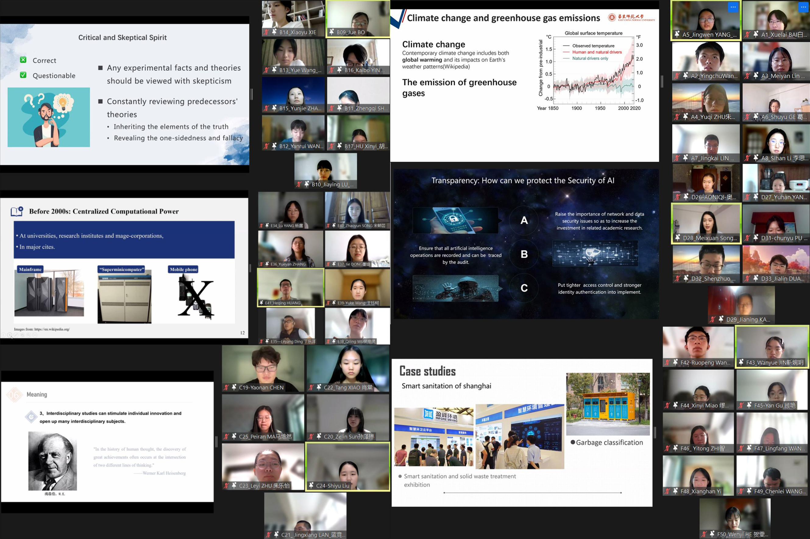 结业展示为自选题小组合作,经过三周的学习合作,六组同学们群策群力,分别从聚焦科学真实理念下正确科研方法的使用、后疫情时代跨学科发展与应用、人工智能的关联应用与道德反思、多学科思考指引下的智慧城市架构案例分析等多个主题呈现了精彩的展示,丰富的实例引用、清晰的逻辑结构、切实落地的思考,给项目师生留下了深刻的印象。展示结束后,黄凯斌教授就研究选题、研究内容及方法等方面进行点评。