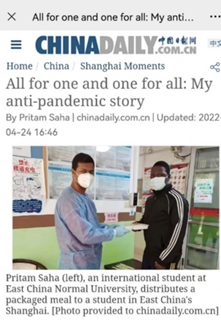 团队成员指导的博士生彭雨(Pritam Saha)在疫情期间积极投身志愿服务。其抗疫故事“All for one and one for all: My anti-pandemic story”刊于China Daily(2022年4月16日)。