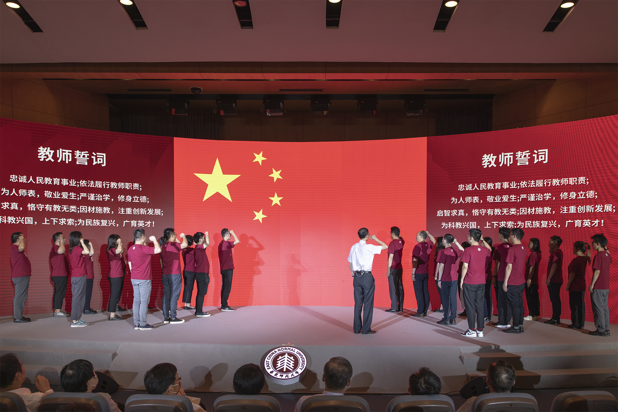 “我宣誓,忠诚人民教育事业……为民族复兴广育英才。”在首批黄大年式教师团队负责人、第十三届师德标兵、教育学部教授李政涛的带领下,新入职的教师们面向国旗庄严宣誓。