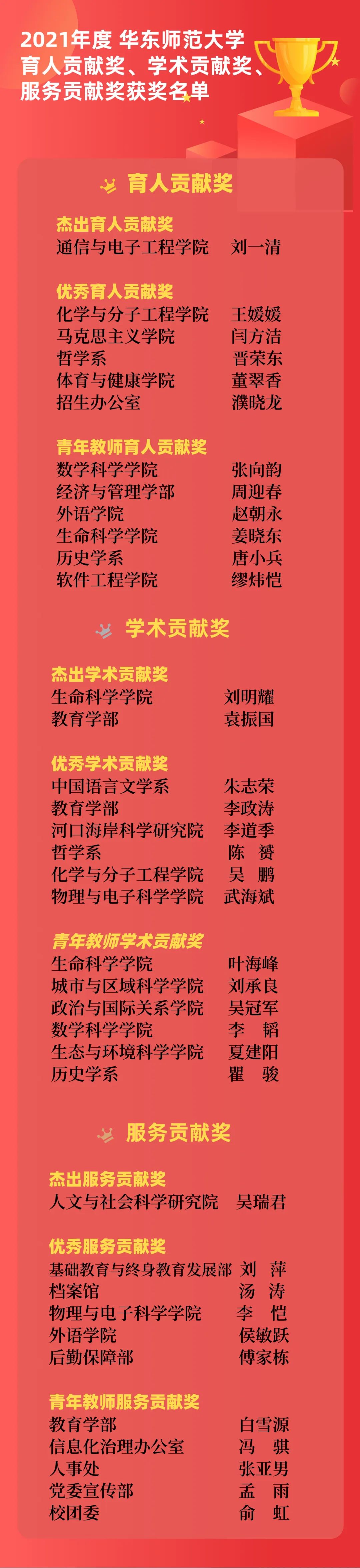 其中,育人贡献奖是对2014年设立的教学贡献奖的传承和创新,将评选对象从“教学”一线教师扩大为“育人”一线教师,体现“全员育人”理念。学术贡献奖是新设立的奖项,体现了学校对卓越学术的明确追求和进一步强调。服务贡献奖则是对2018年设立的管理服务贡献奖的继承和完善。“三大贡献奖”是学校为做出突出贡献的教职工颁发的最高奖项。