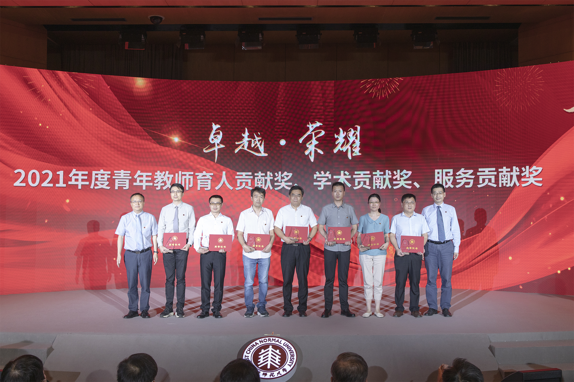 在全场热烈的掌声中,校领导梅兵、钱旭红、朱民、杨昌利、曹友谊、戴立益、雷启立、顾红亮分别为学校2021年度育人贡献奖、学术贡献奖、服务贡献奖获得者,第十三届师德标兵荣誉称号获得者,满30年教育工作龄的教师颁发证书、奖杯,今年新入职的教师代表向受表彰的教师献花致敬。