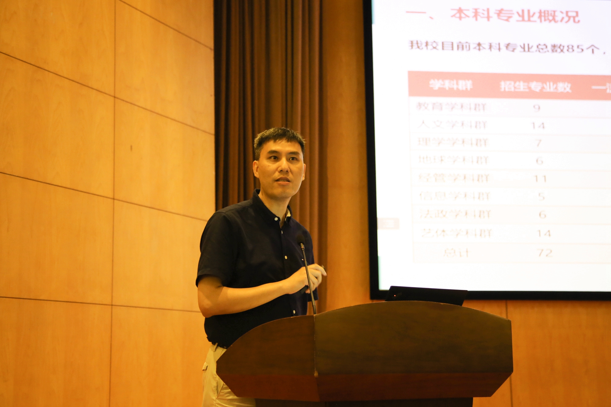 孟钟捷用详实的数据和资料分析了我校专业招生、培养、就业情况,介绍了学校招生-培养-就业联动机制建设方案和专业动态调整方案。他表示要明确“质量核心、需求导向、规模控制”的专业动态调整原则,持续完善专业动态调整指标,实施年度招生计划动态调整机制。