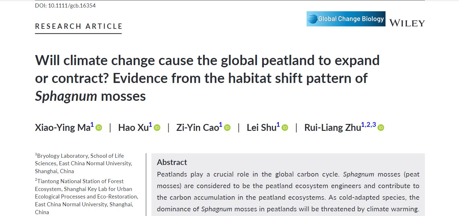 该成果以“Will climate change cause the global peatlandto expand or contract? Evidence from the habitat shift pattern ofSphagnummosses”为题于7月28日在线发表在 Global Change Biology 。论文的第一作者为博士研究生马晓英,通讯作者为生命科学学院朱瑞良教授,硕士生徐浩和曹子寅以及舒蕾讲师参与了本项研究。