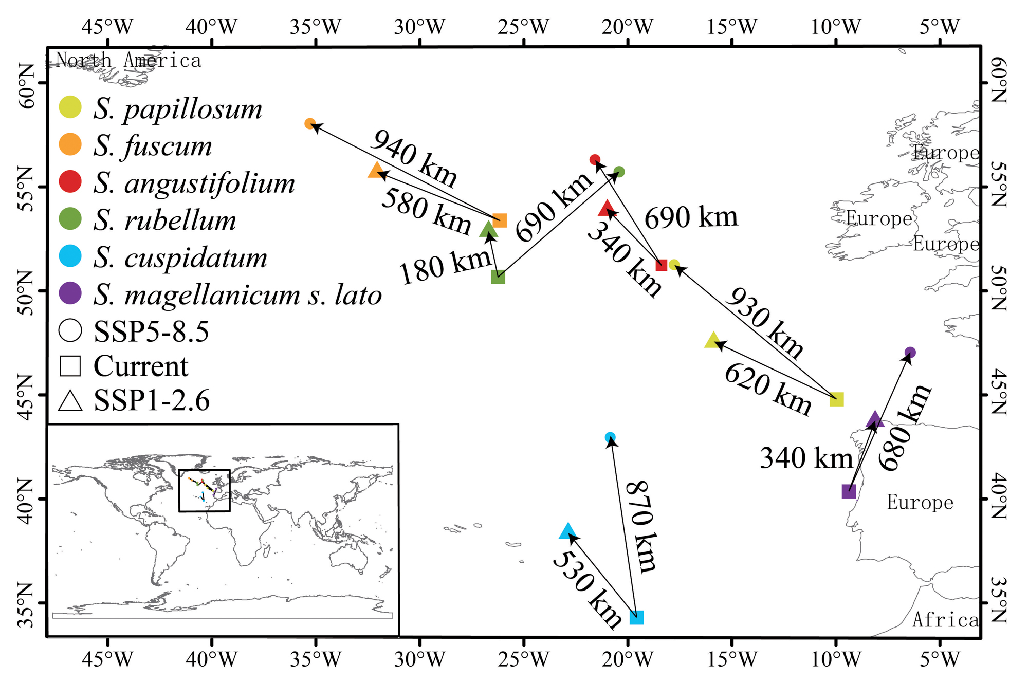 和现代相比,2070年不同气候情境下泥炭藓物种适宜分布区的质心变化