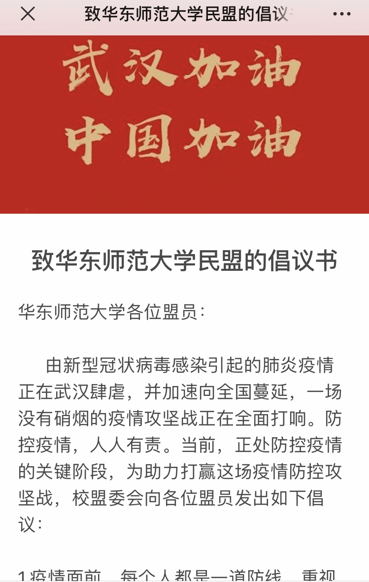 当前,新型冠状病毒感染的肺炎疫情防控工作正处在关键时期。我校统一战线广大成员坚决贯彻落实习近平总书记关于疫情防控工作的重要讲话精神,严格按照市委、市政府的统一部署,积极响应学校制定的各项措施,主动履职,积极作为,为坚决打赢这场疫情防控战争,贡献力量。