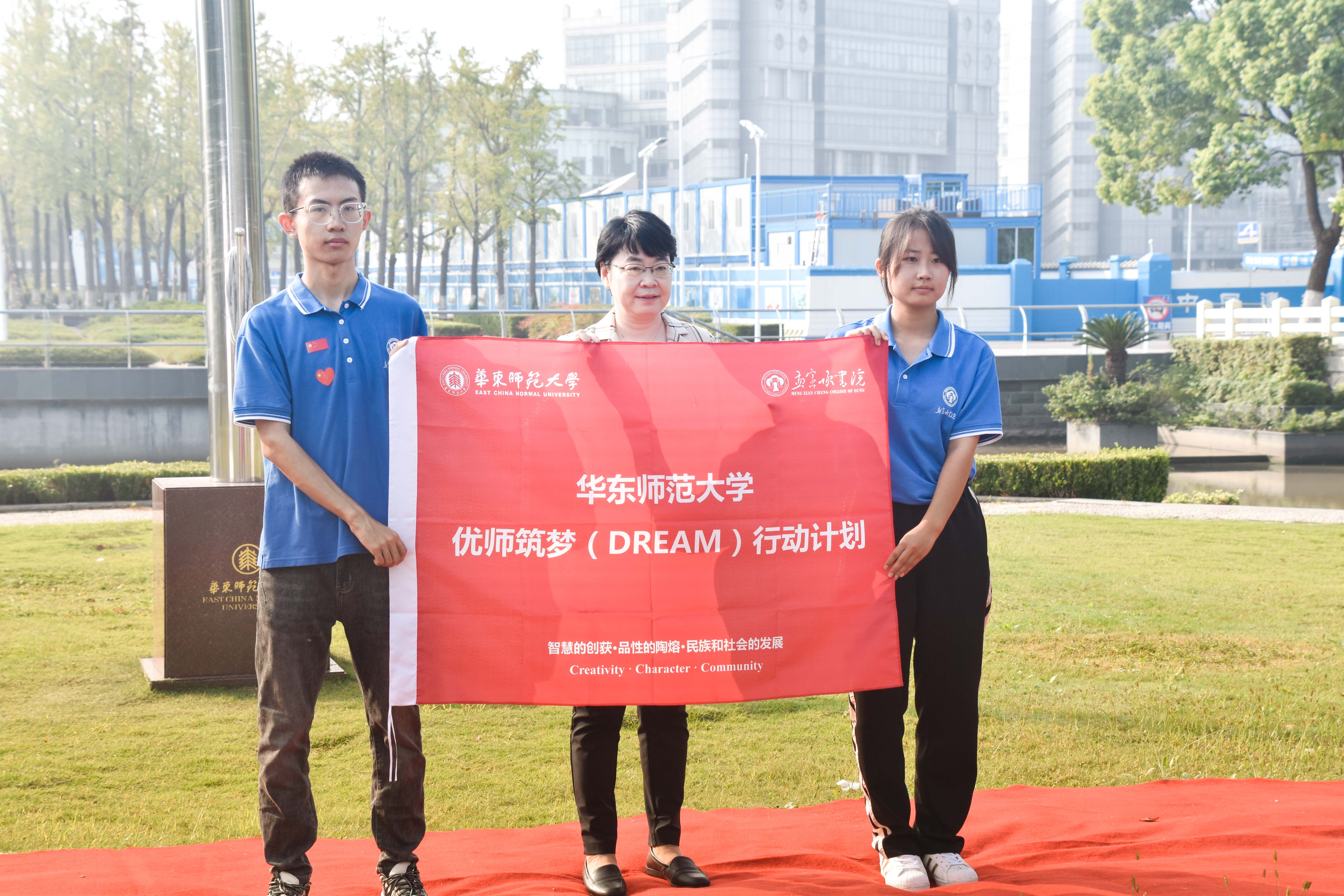 在闵行校区升旗仪式现场,孟宪承书院党委书记兼院长吴薇为2022级“优师计划”师范生授旗,并宣布新一轮“完美(中国)官方优师筑梦(DREAM)行动计划”正式启航。