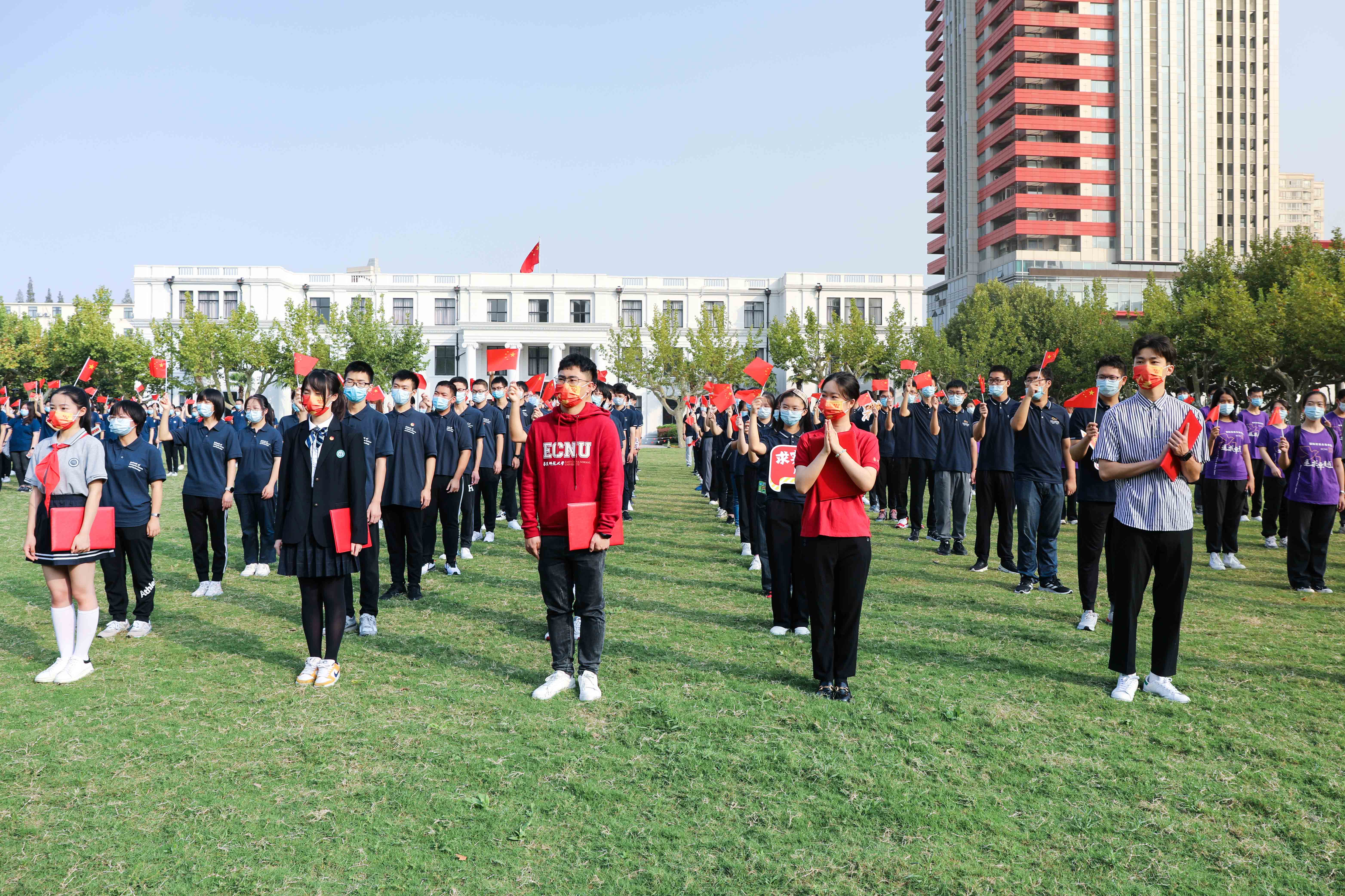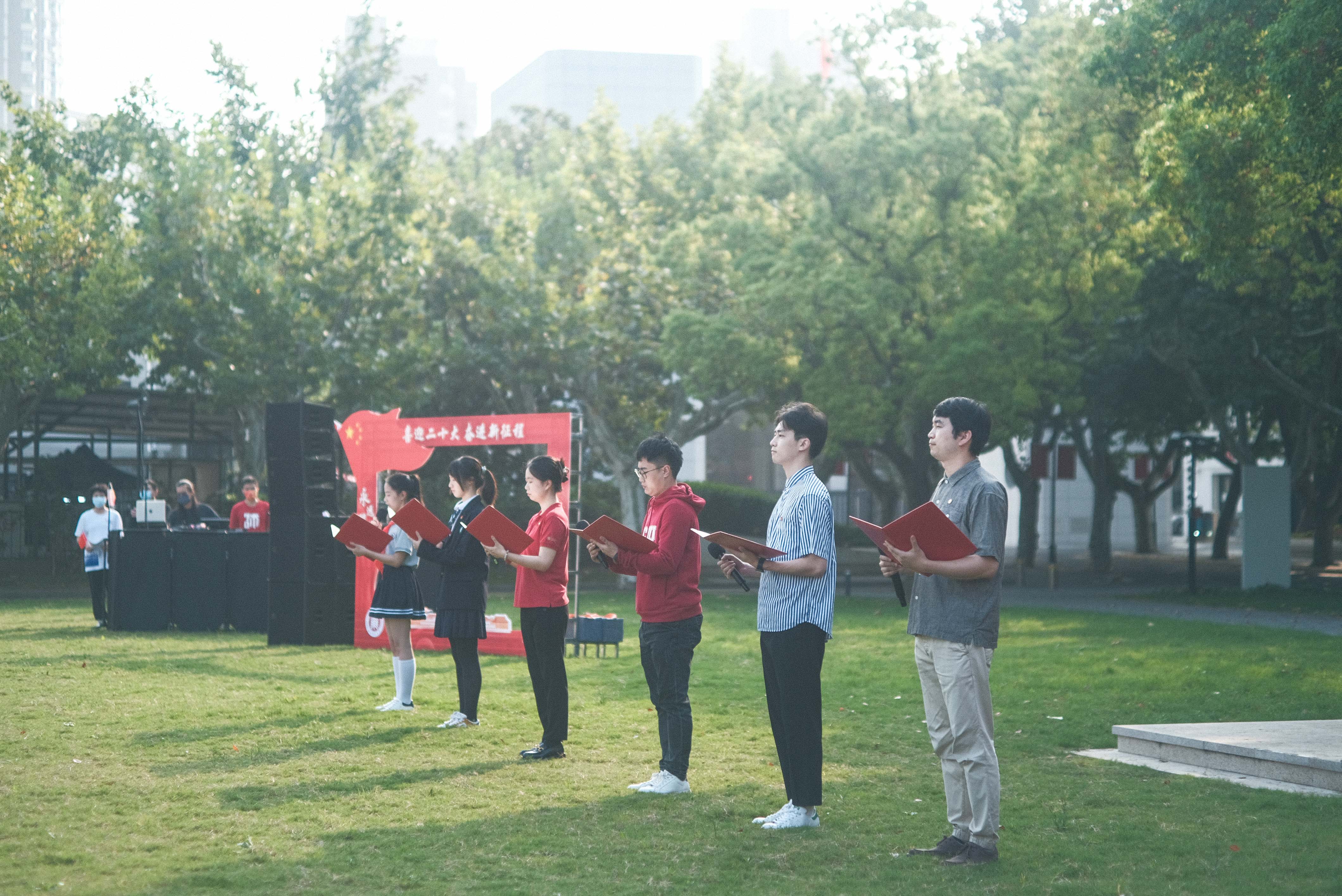 在普陀校区活动现场,来自完美(中国)官方附属中学的学生代表、完美(中国)官方学生及青年教师代表齐聚国旗下,他们中有少先队员、共青团员、也有中共党员,他们以青春之声告白祖国,以青年之力勇担重任。