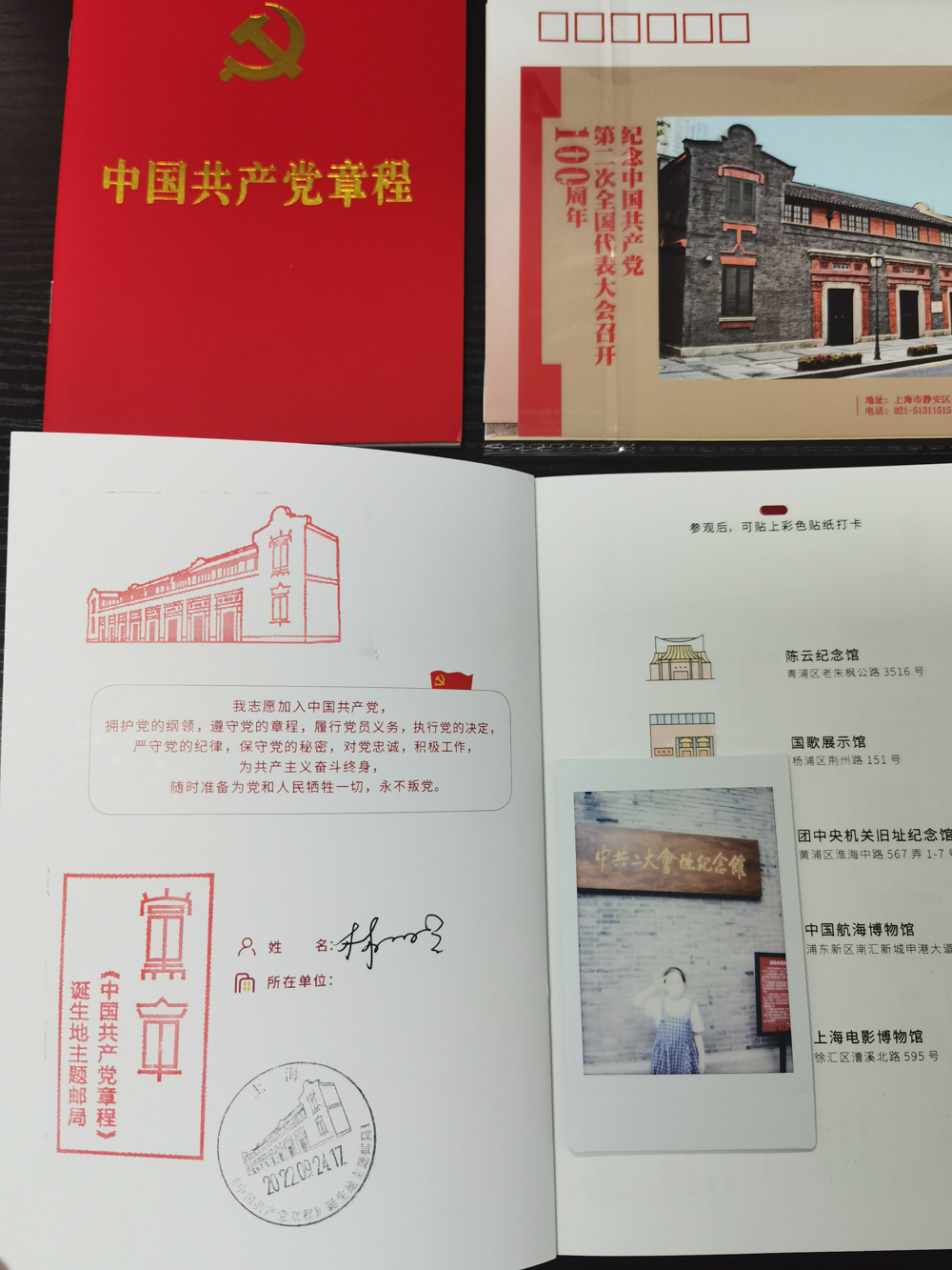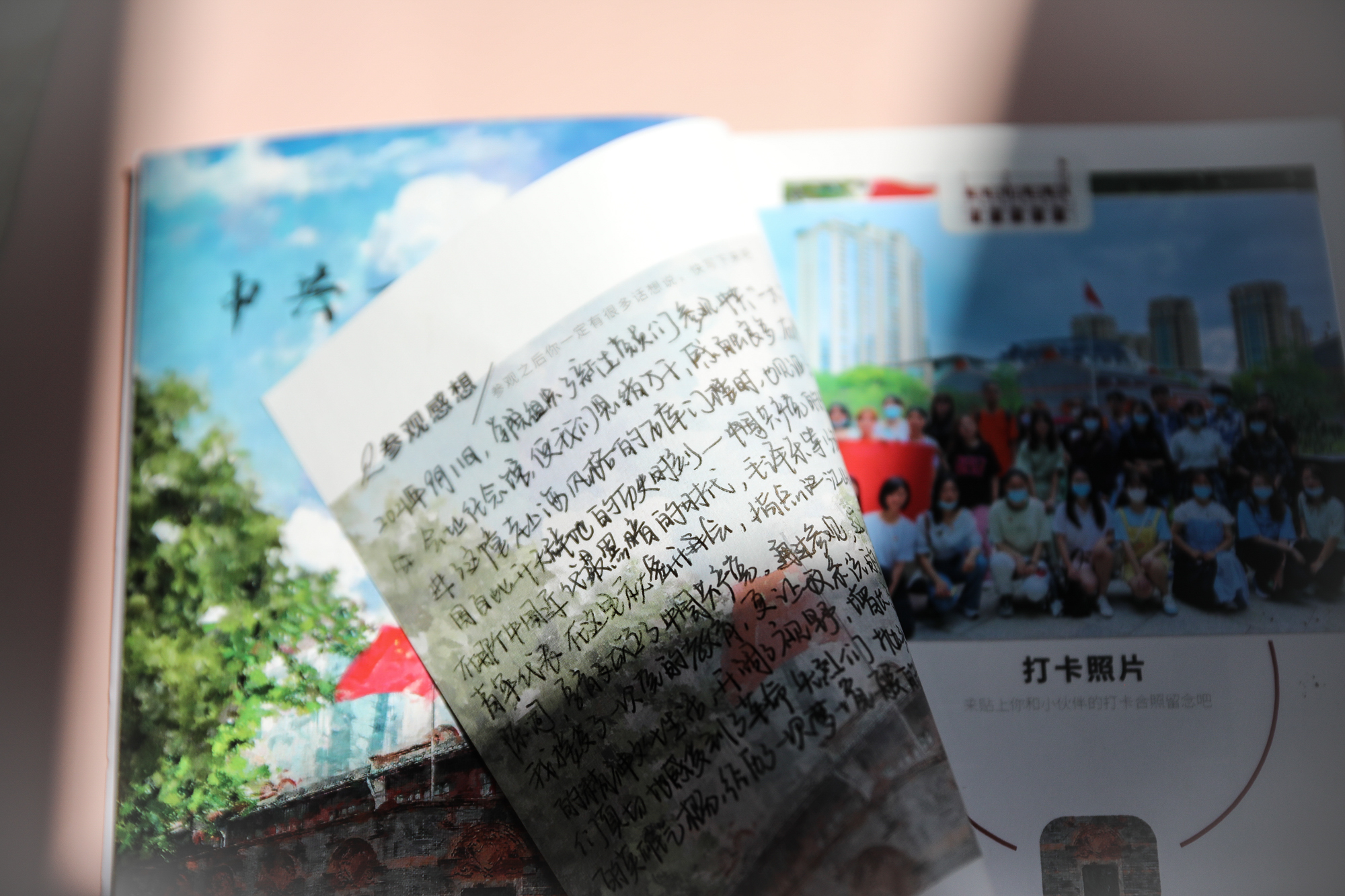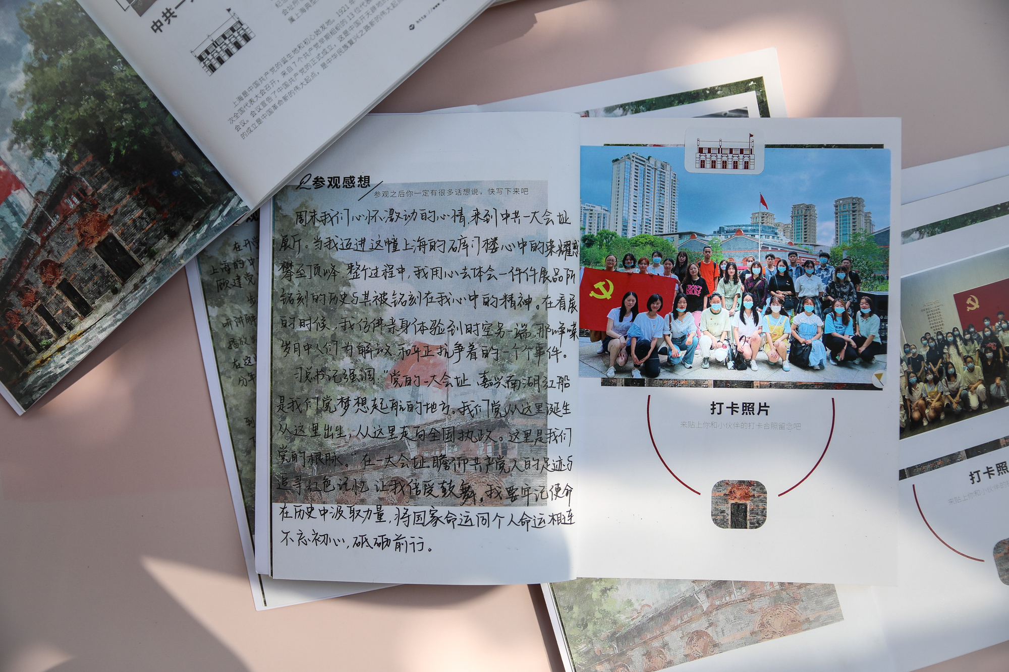 作为一名新生党员,翁泽华等同学在学院党务老师的带领下组织参观了中共二大会址纪念馆,并带着设计学院原创的手册,参观后写下了感想、贴上了小旗子贴纸、盖上了纪念馆里的印章、上传了参观照片,这样的互动打卡环节让大家更有参与感和融入感,使参观的印象更为深刻,也让同学们对其他红色基地参观学习充满向往。