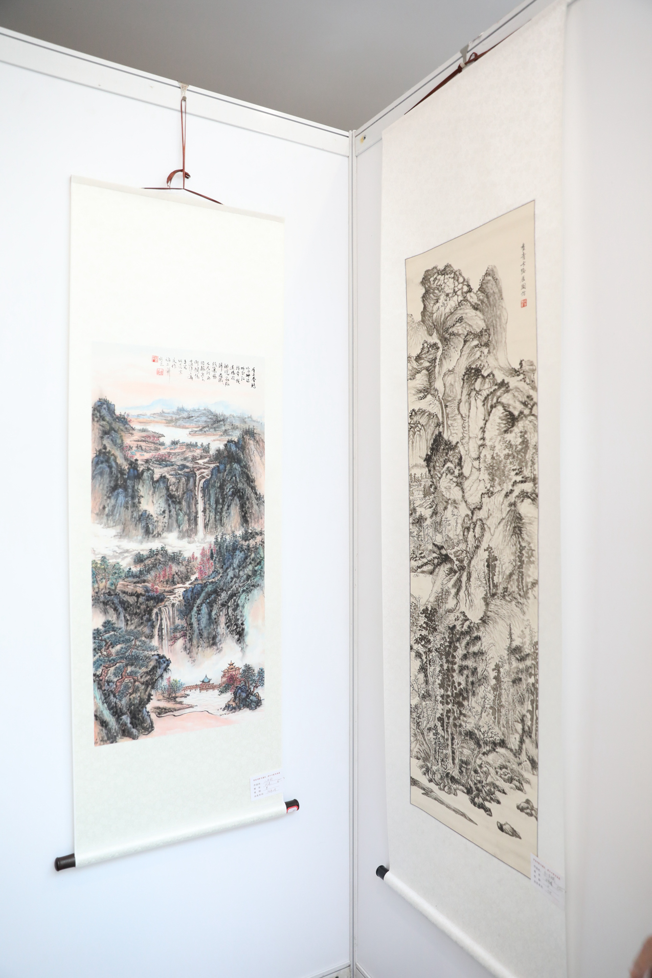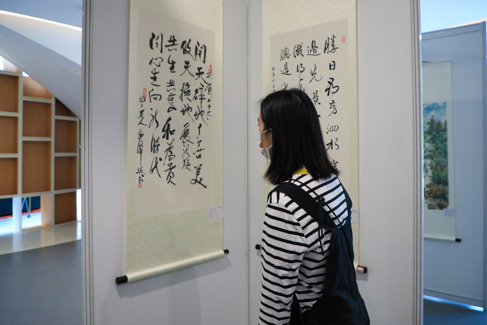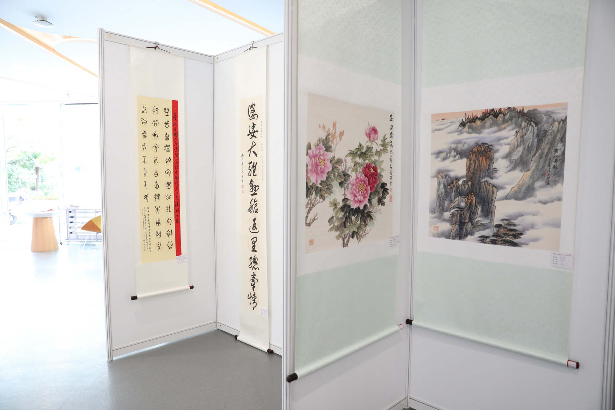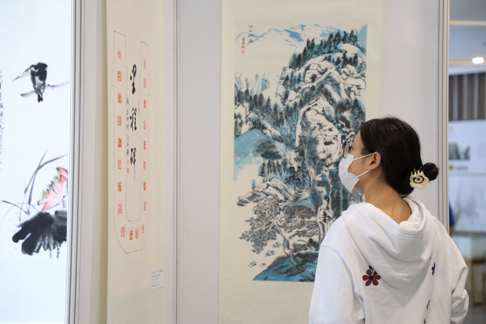进入展厅,迎面而见的是由苏春生教授题书的“喜迎二十大 奋进新征程”的展板,鲜明地展示了本次展览的主题。展厅内书法、绘画、篆刻等艺术作品琳琅满目、精彩纷呈。既有直抒胸臆、楷行隶篆兼具的书法作品,也有赞美祖国大好河山,描绘青山绿水、百花吐艳的清丽自然图景,更有礼赞奥运世博圆梦、航天潜海建功的新时代画卷。